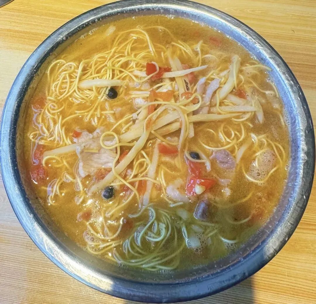 还点了一份老友伊面。伊面吸汤能力比粉强,泡在汤里软乎乎的,裹着酸笋和番茄的味道,吃起来比粉更入味一点。