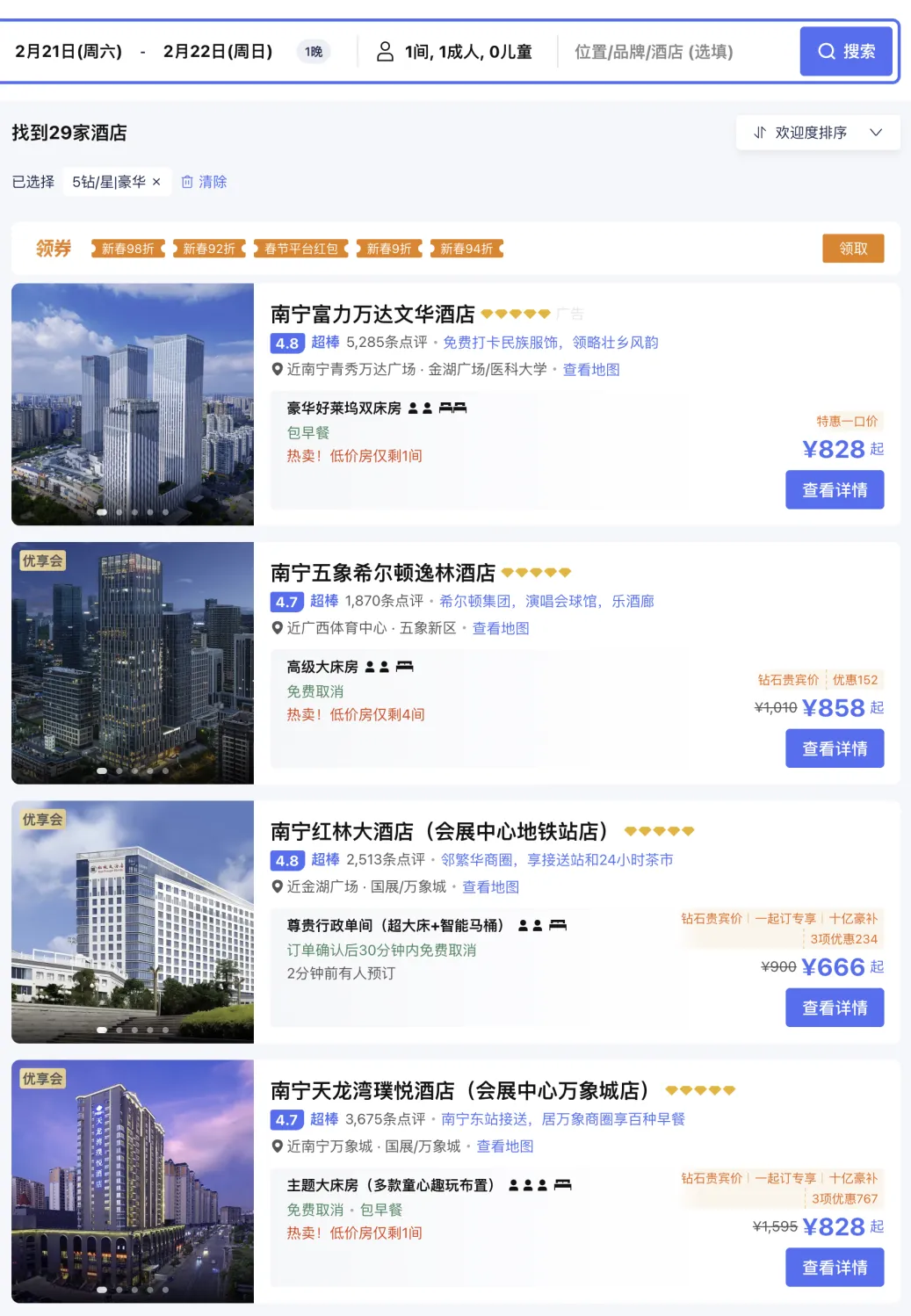 下面截取来自携程的今日(2026.2.21)南宁五钻/五星/豪华型酒店房价。