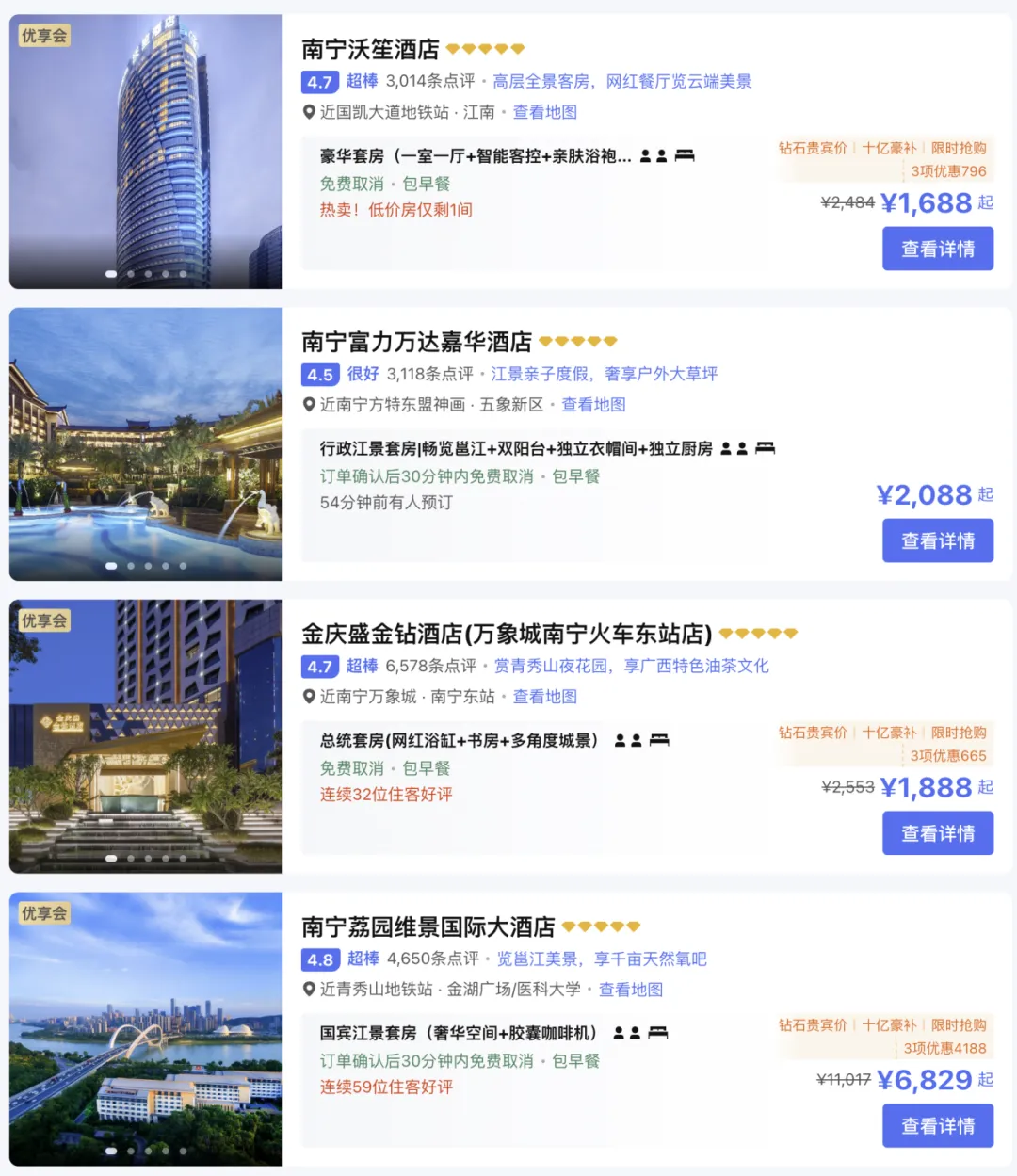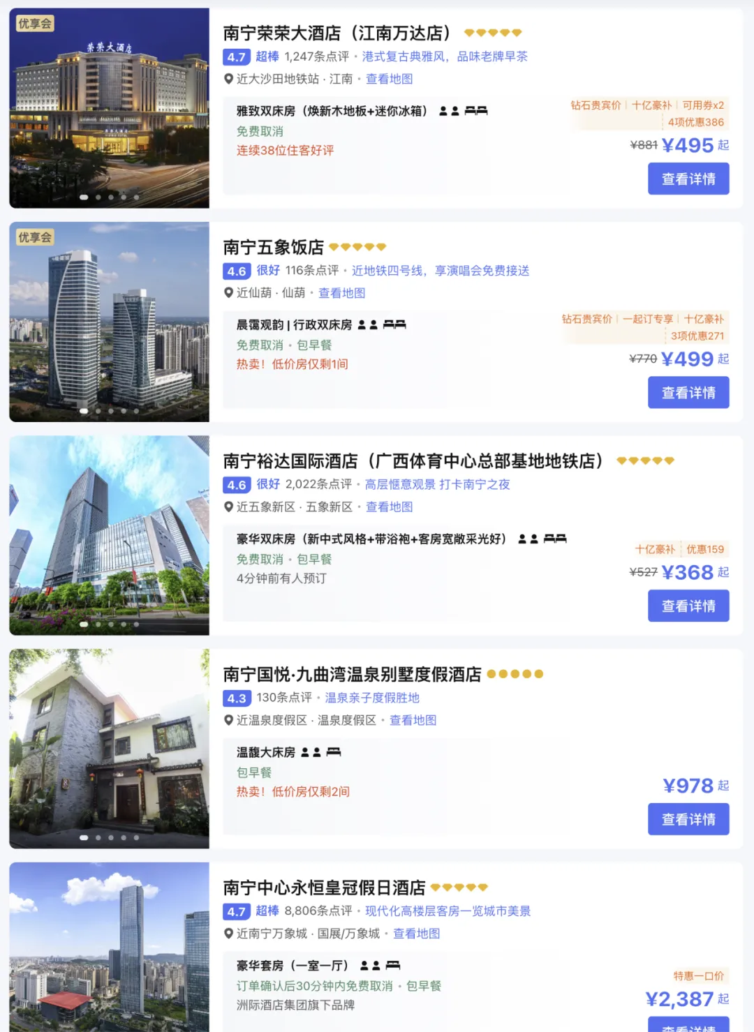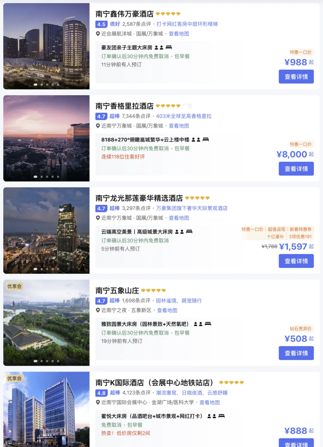 供给有限:南宁高端酒店数量相对固定,短期内无法增加供给。热门区域如老市中心、青秀山、万象城周边的五星酒店房间数量有限,形成“一房难求”局面。