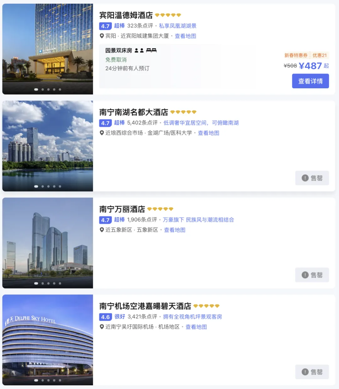 南湖名都大酒店、南宁万丽则显示「售罄」。多数五星/豪华酒店价格为平日的2倍以上,基础型酒店则涨幅更甚。