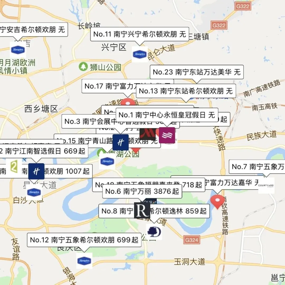 ▲南宁市中心区酒店分布及价格,欢朋飙至上千