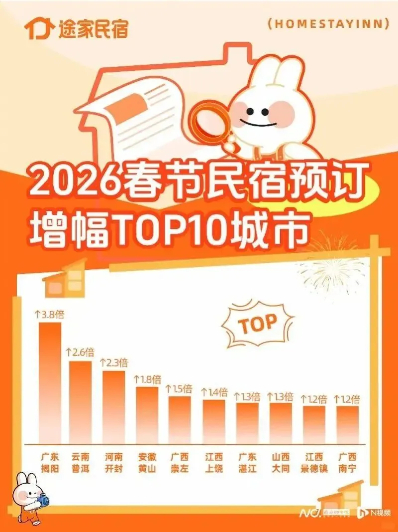 春节民宿预订方面,南宁民宿预订量上涨120%,入围全国预订增幅前十。