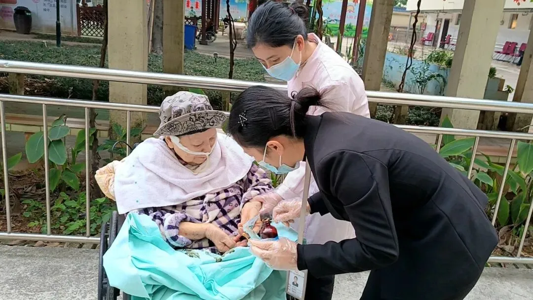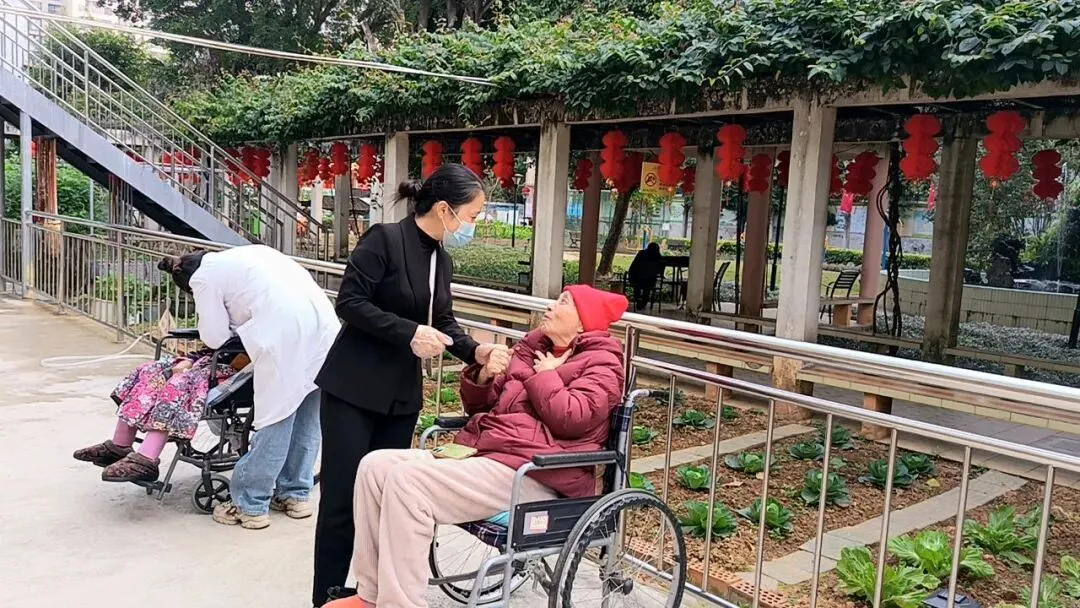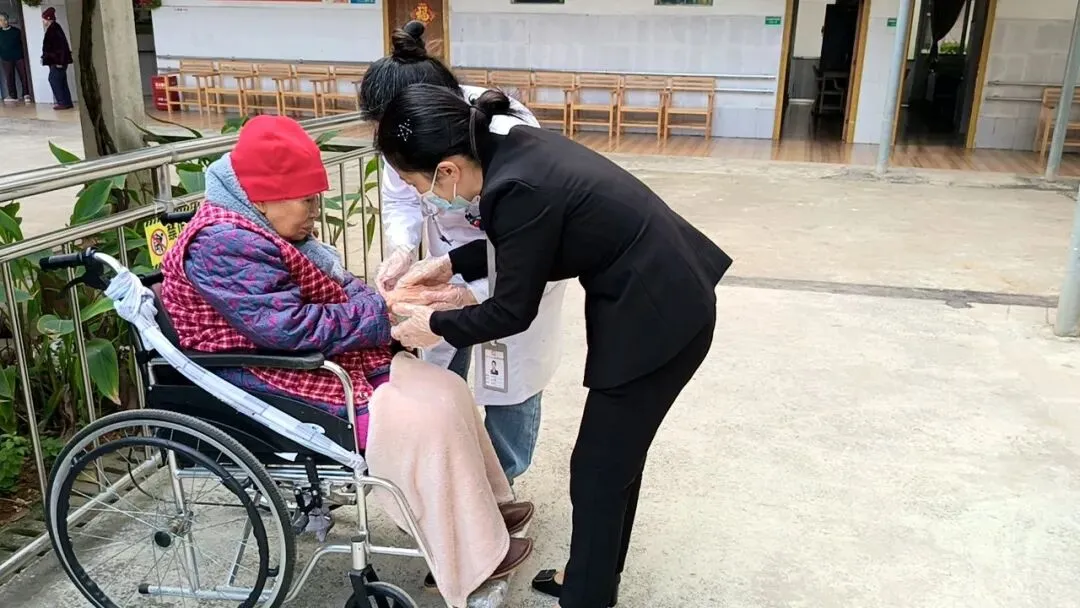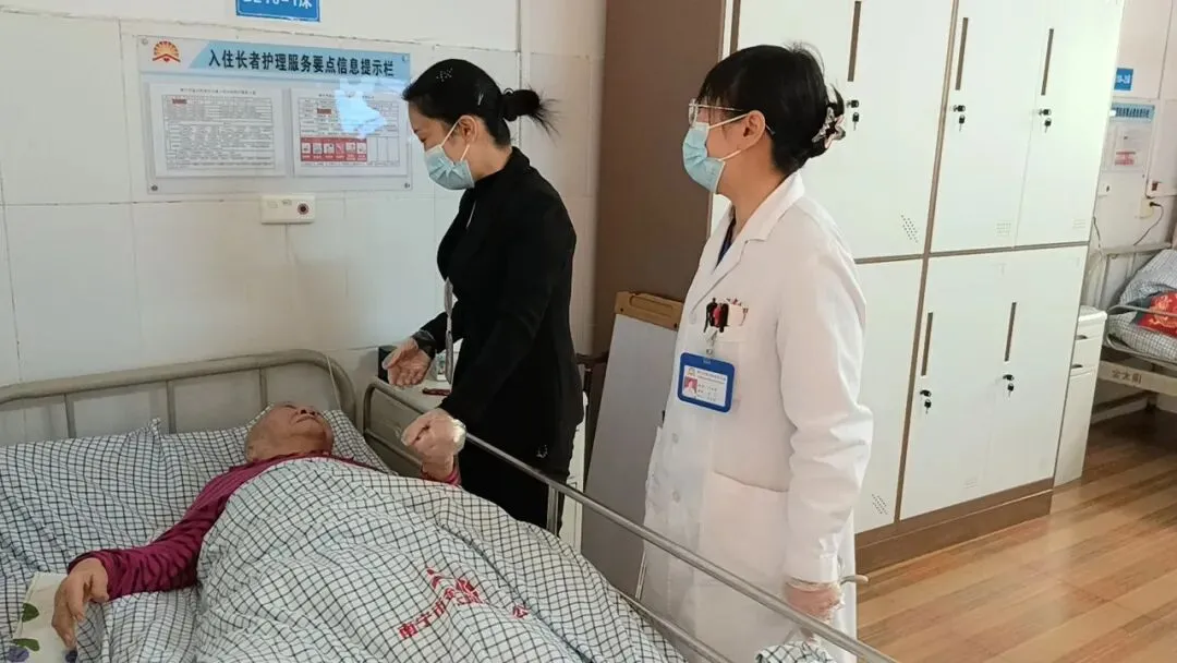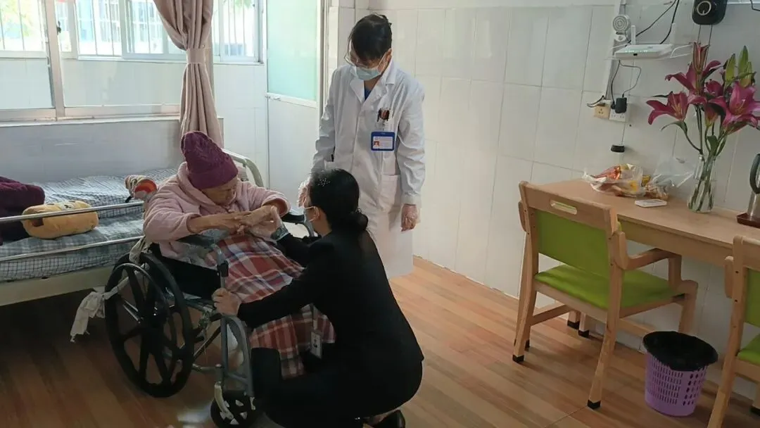 晨会刚刚结束,罗副院长随即带队开始每日必须进行的查房。她带领医护人员逐一走进长者房间,俯身床前,仔细询问每位长者的身体状况,认真检查用药记录、悉心叮嘱护理注意事项。每到一处,她都亲切地与长者交谈:“今天感觉怎么样?”“过年开心吗?”一句句家长里短的问候,传递着家人般的关怀。查房不仅是工作的例行,更是温情的传递,让长者在节日里感受到稳稳的安心与陪伴。
