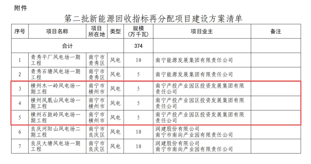 风芒能源获悉,近日,广西壮族自治区能源局印发第二批新能源回收指标再分配项目建设方案,南宁产投集团旗下南宁产投产业园区投资发展集团有限责任公司成功竞得三个陆上风电项目建设指标,总装机容量150MW。