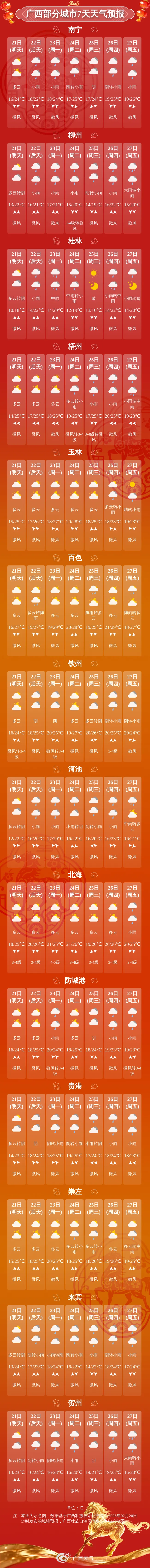 21日白天:全区多云,有分散小雨。最低气温:桂东北10~13℃,其他地区13~18℃。