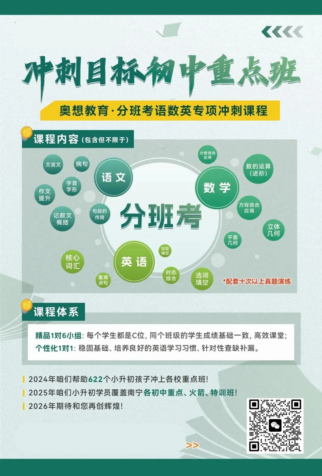 小学最后一学期是小升初冲刺的黄金期——分班考、学校适配、升学准备,每一步都关乎孩子初中三年的起点。今天,就为各位西乡塘小升初家长整理了一份超全面指南,涵盖热门公办初中详解、分班考时间+考情、年后备战方案,帮你理清思路,精准发力,助力孩子赢在初中起跑线!