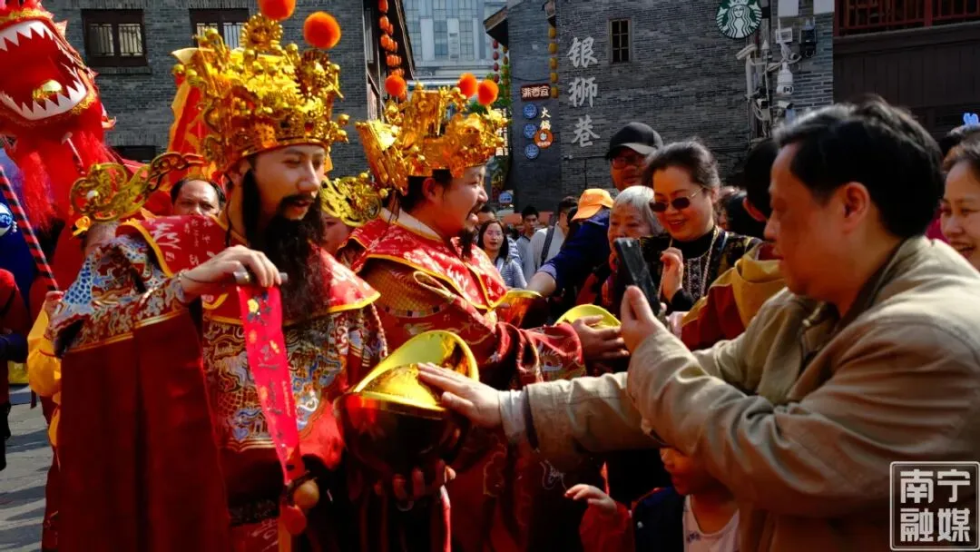 上午9时许,锣鼓喧天,巡游队伍以城隍神像为核心,传统仪仗肃穆开道,民俗表演方阵紧随其后,五路“财神”身着锦袍穿行于古城街巷,沿途向市民游客派发糖果福礼。“第一次来南宁过年,就遇上这么热闹的庙会,空气好、年味足,真是来对了!”辽宁游客潘万龙携家人驻足观看,手中刚接过的“财神”糖果让孩子笑逐颜开。