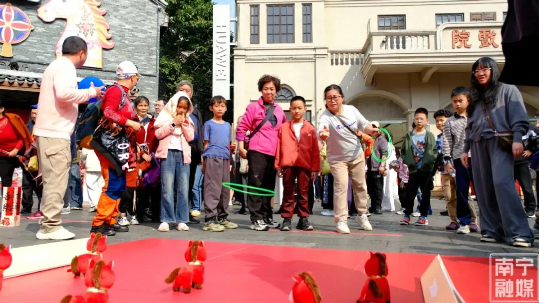 在巡游的热闹烘托下,城隍庙门口及中华大戏院前广场同步开启“游园会·乐嬉祈马岁”活动,投壶射艺、马运转盘、滚滚马球、蒙眼敲锣等传统游戏吸引市民踊跃参与。下午3时、晚上7时许,非遗庙会秀精彩上演,马山会鼓、广西山歌、南派相声、粤剧表演等轮番登场,让市民沉浸式感受地方文化魅力。