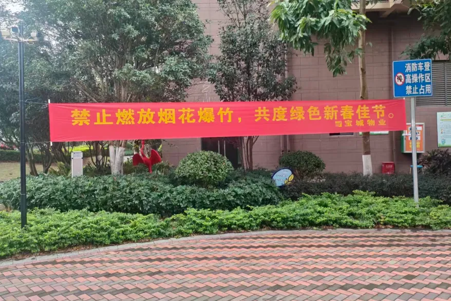 在各个项目公告栏张贴烟花爆竹禁燃限放海报,在园区道路旁、业主活动区域悬挂宣传横幅、在各业主群宣传。