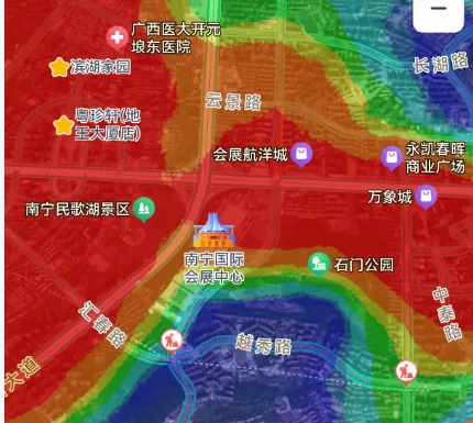 ▲2月22日晚,南宁国际会展中心、民歌湖周边热力图
