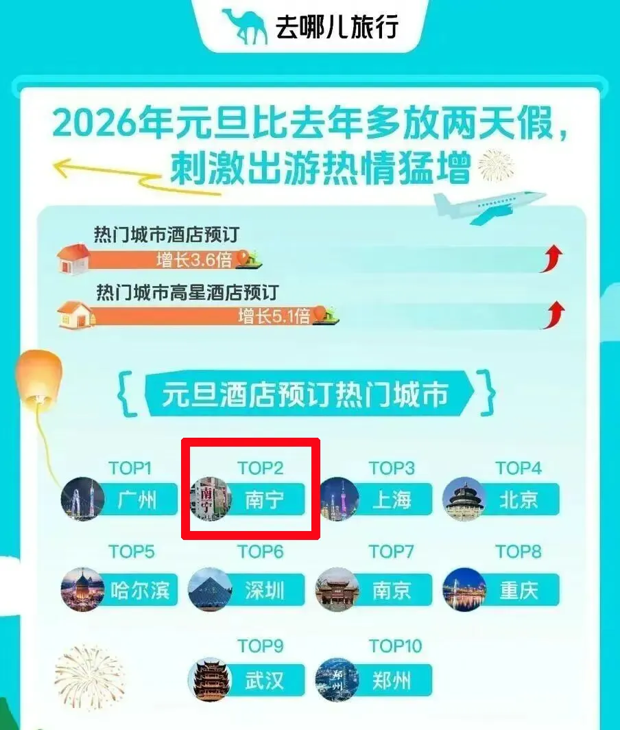 南宁首次跻身元旦热门目的地前三。