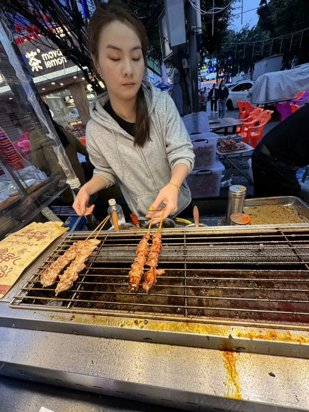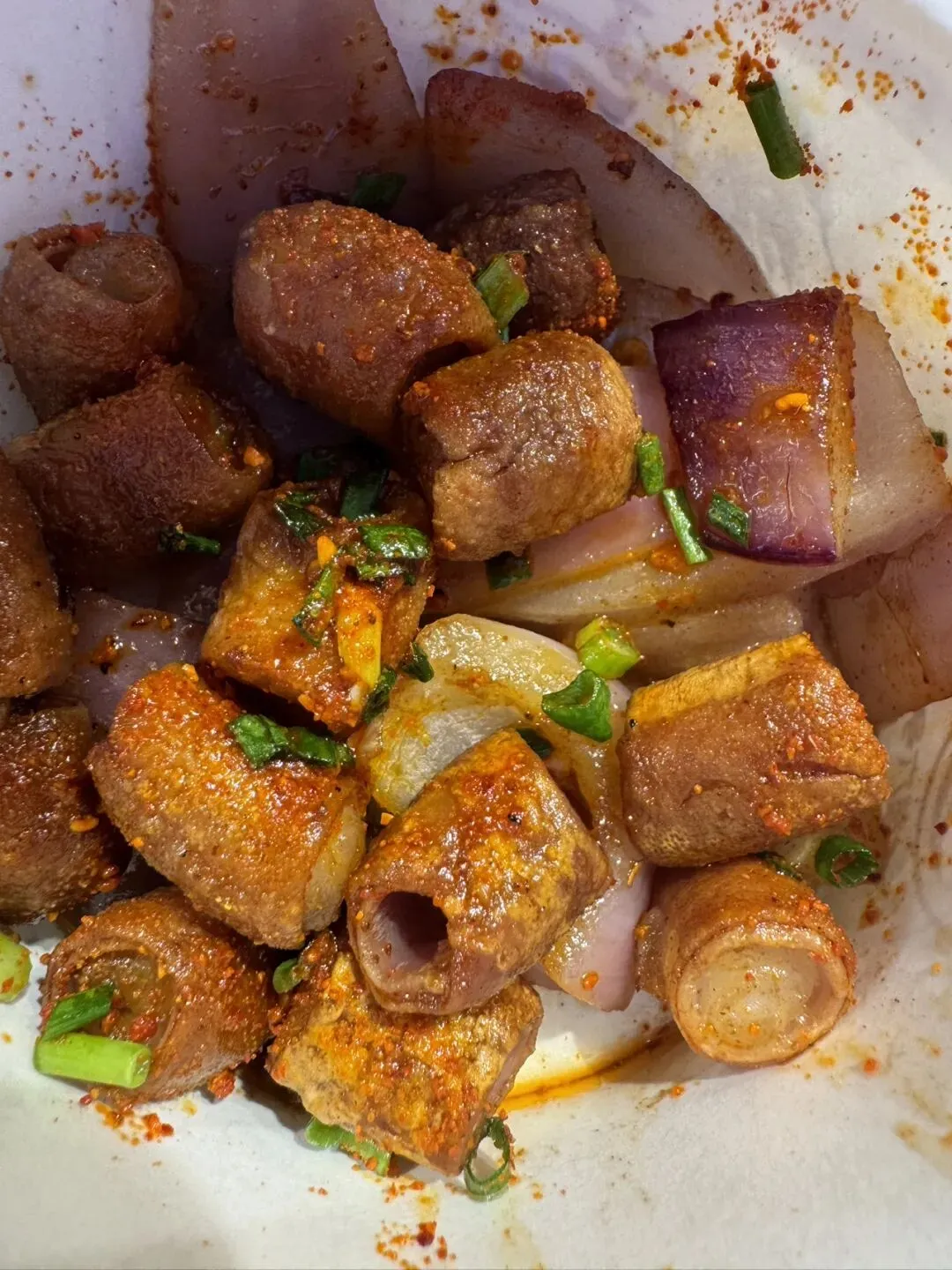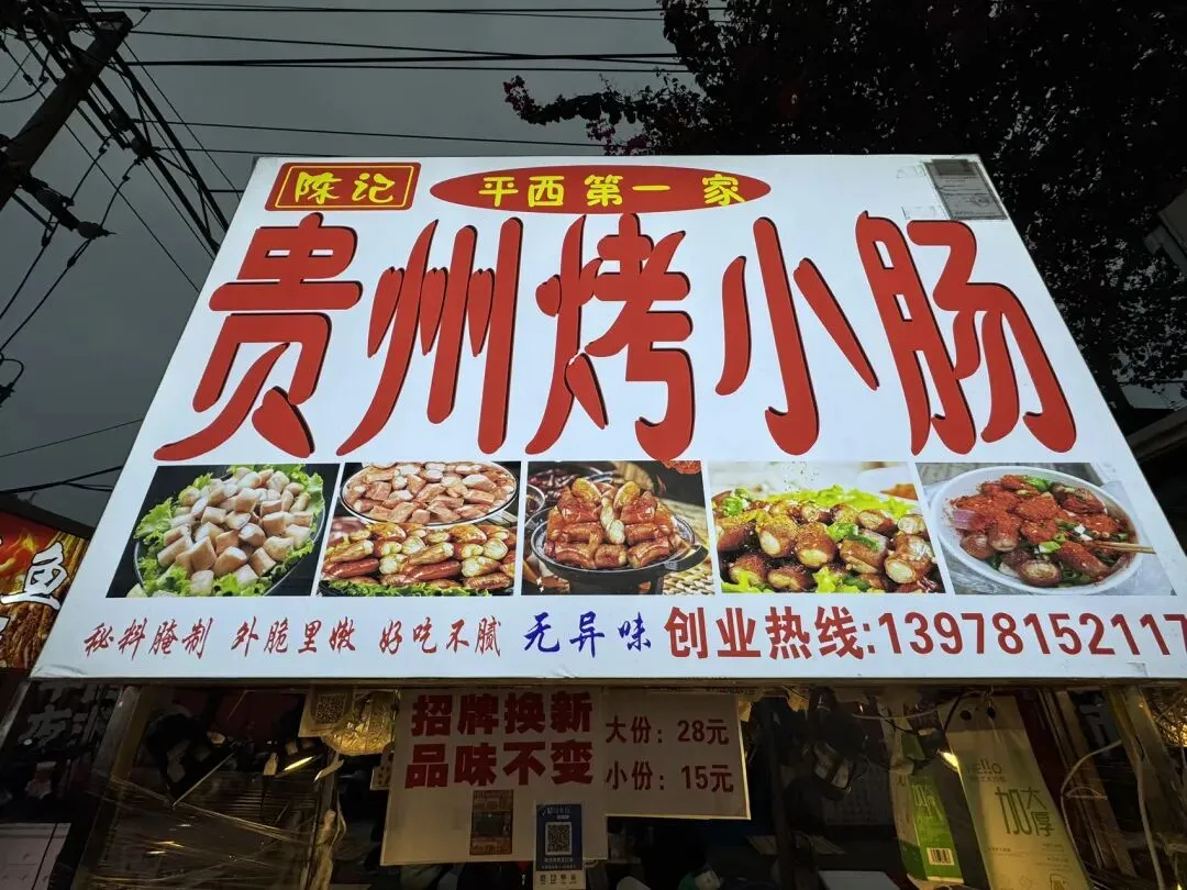 贵州烤小肠,说是烤,其实是放在铁板上煎。平西夜市的烤小肠大多是预煎过的,顾客点单时加上洋葱等配料炒一下出锅,个人觉得口感没有西关吃过的现烤的香脆;