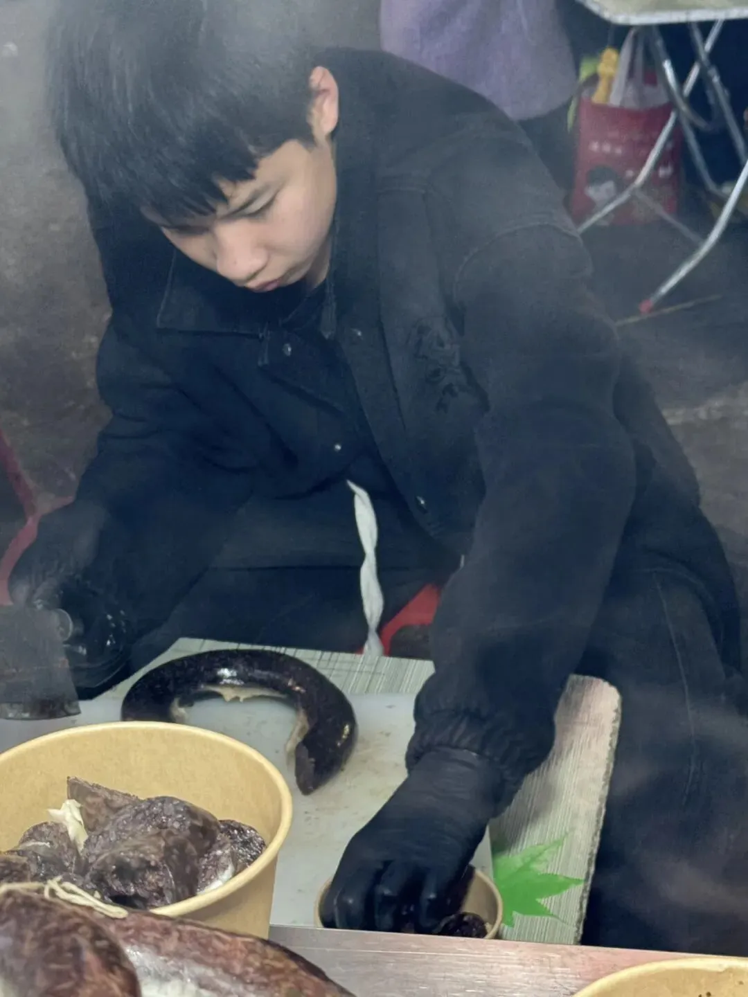 在摊位前站了好一会儿,促使我下决心的是看到了女摊主后面的孩子——那么小的男孩,安安静静地坐在后面,帮妈妈把血肠切成小块并分装成一份一份的。我看了莫名的感动。血肠本身并不合我俩的口味,两人一份都没吃完。