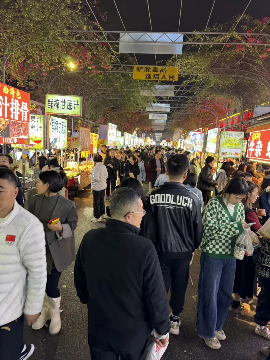 进夜市还好,人多,没太挤。一路逛完,想原路返回,就千难万难,找个成语形容一下:水泄不通。不得不一会儿左拐一会儿右拐,有时还不得不停下来观察一下再走。