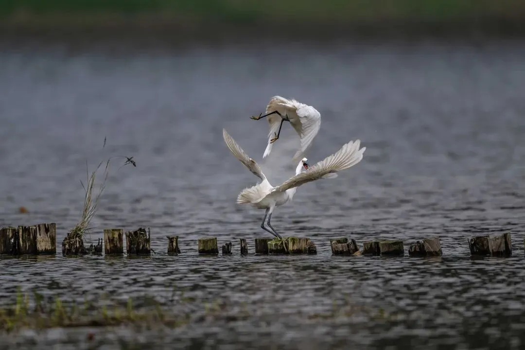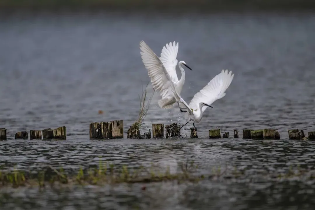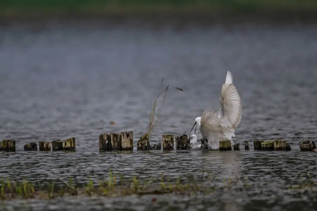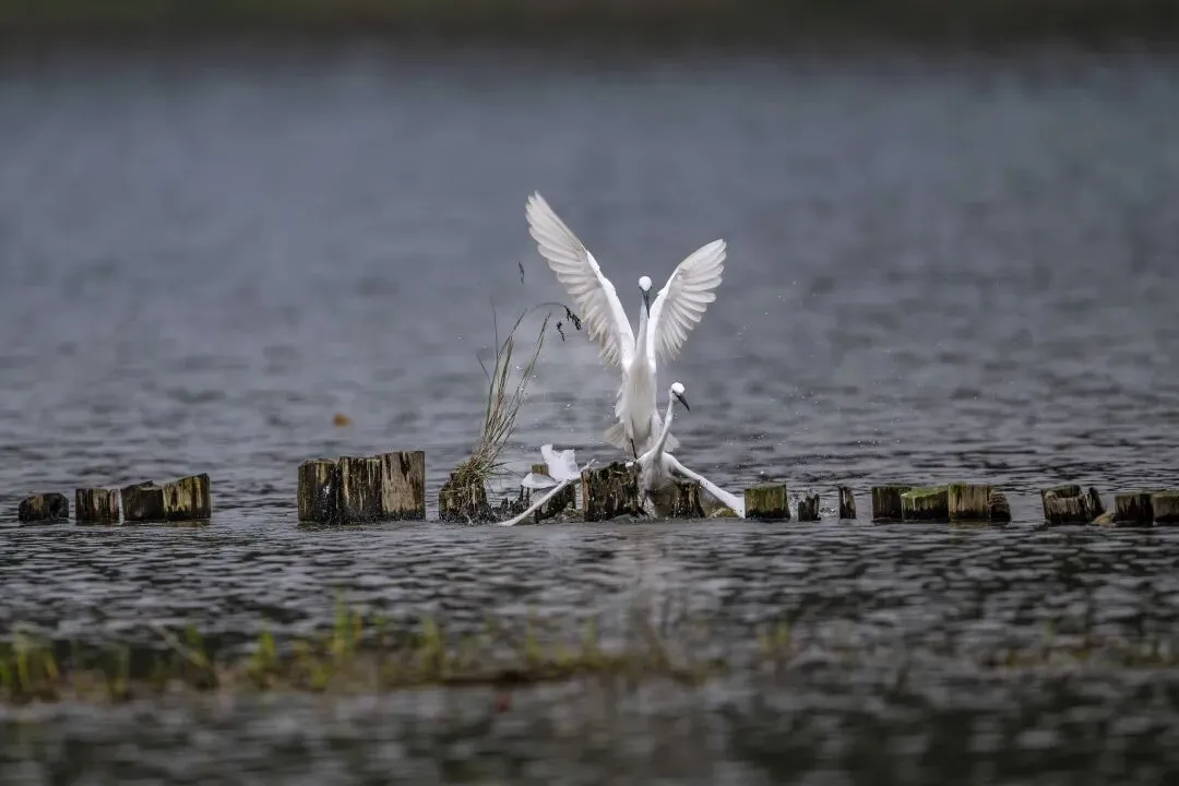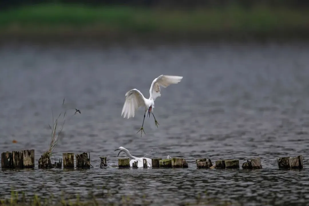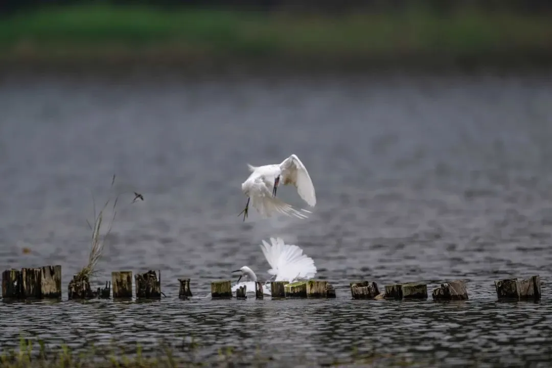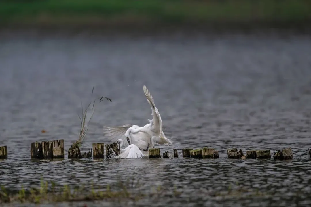 当一缕阳光穿透云层洒向湖面时,树状旁边平静的水面突然泛起涟漪。两只成年白鹭为争夺靠近湖边树状的捕鱼领地,展开了一场惊心动魄的较量。