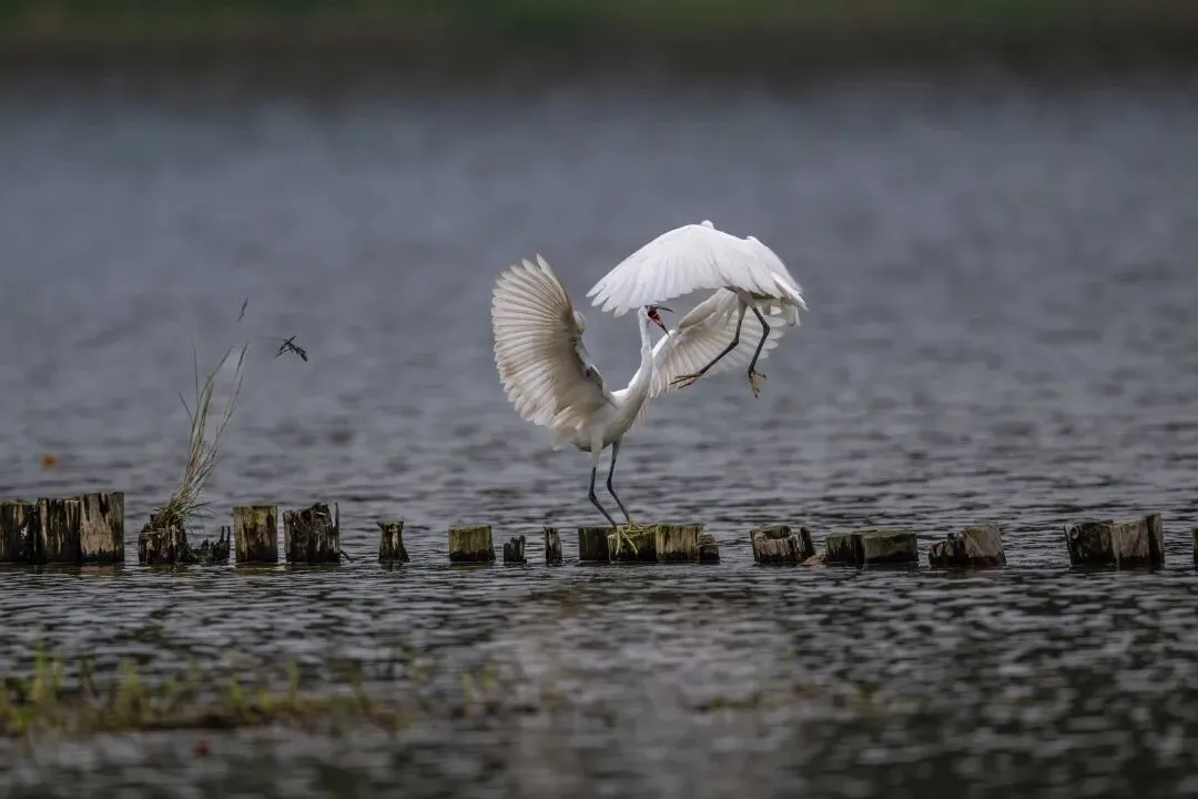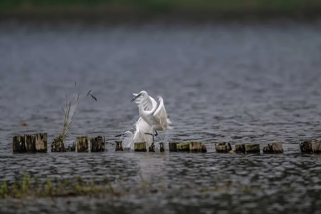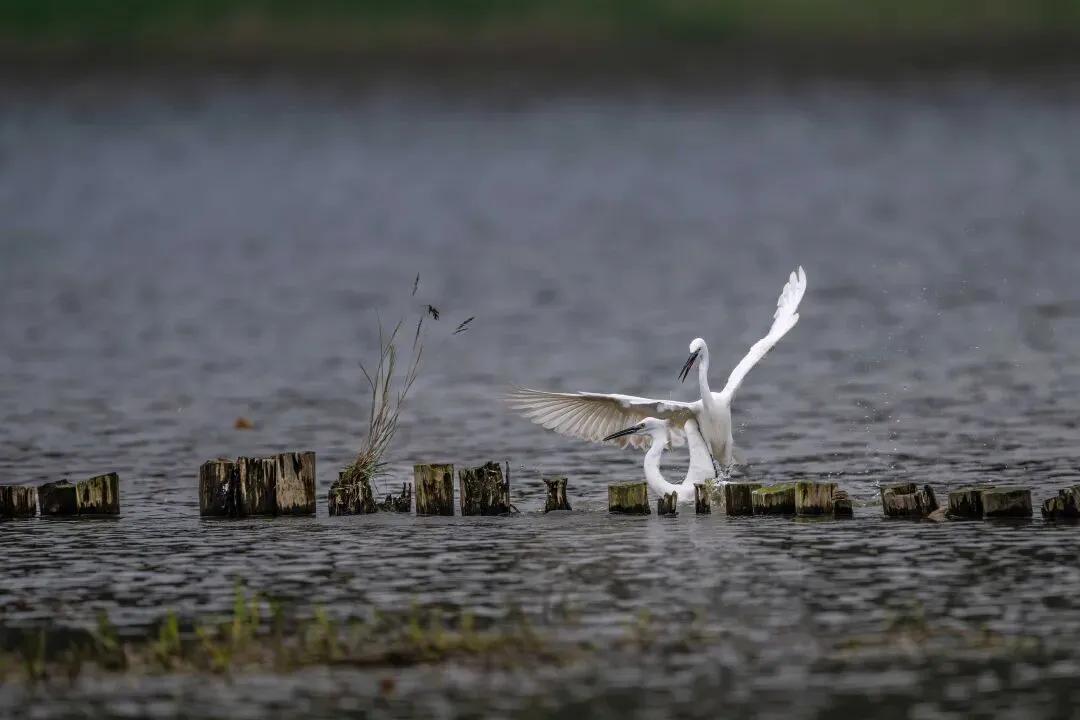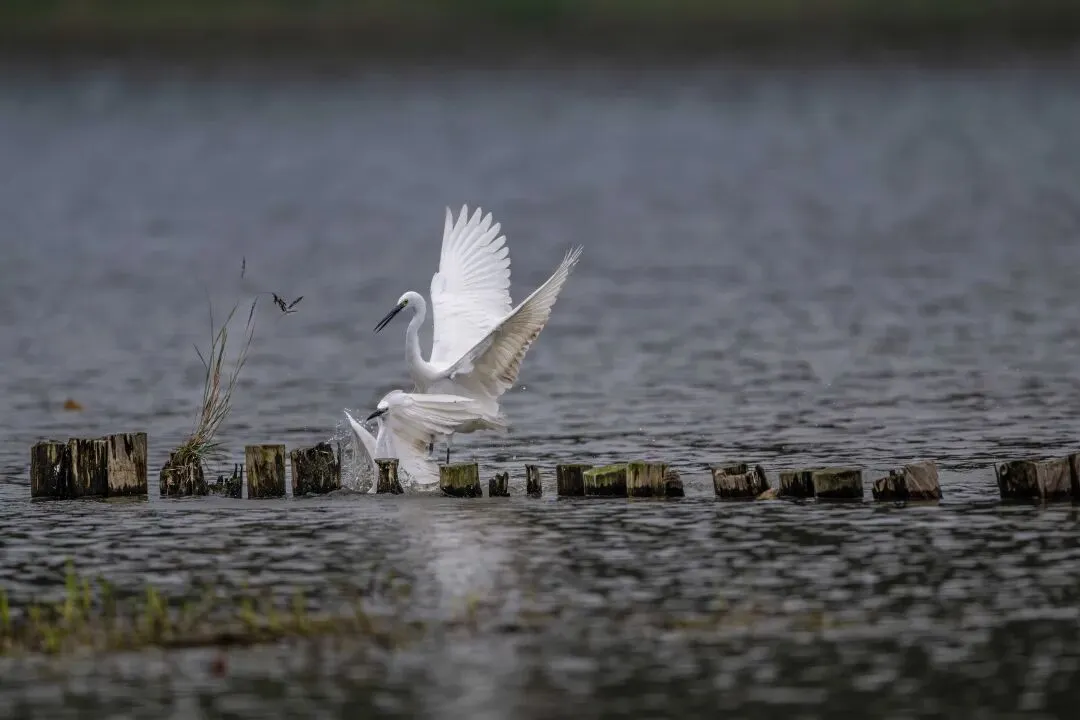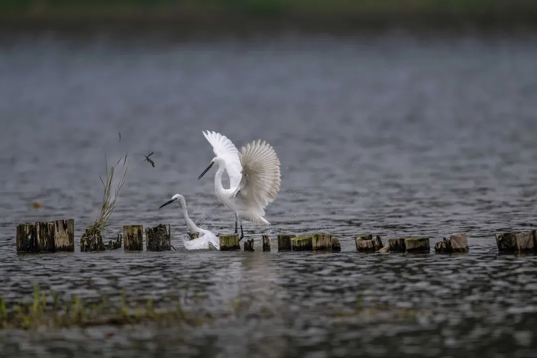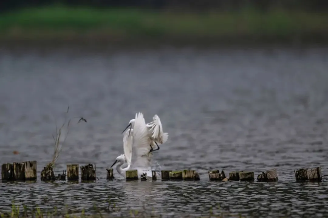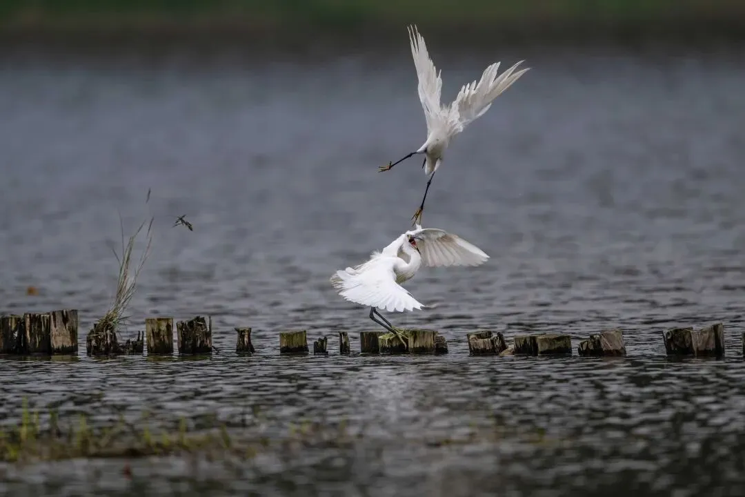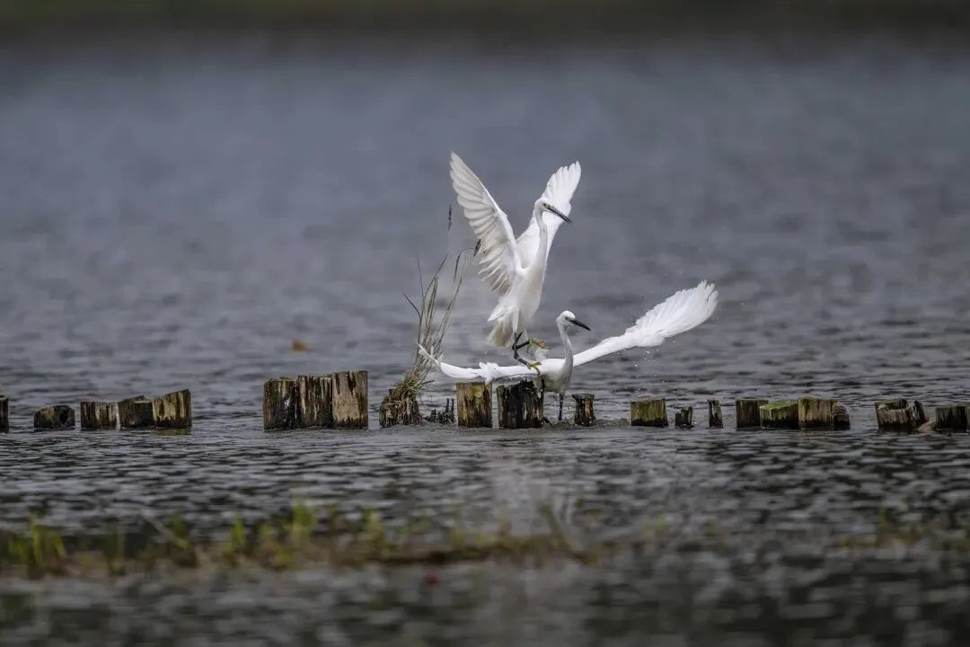 当一缕阳光穿透云层洒向湖面时,树状旁边平静的水面突然泛起涟漪。两只成年白鹭为争夺靠近湖边树状的捕鱼领地,展开了一场惊心动魄的较量。