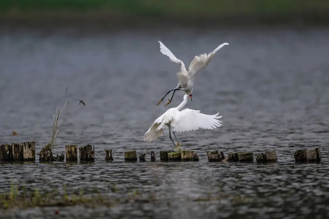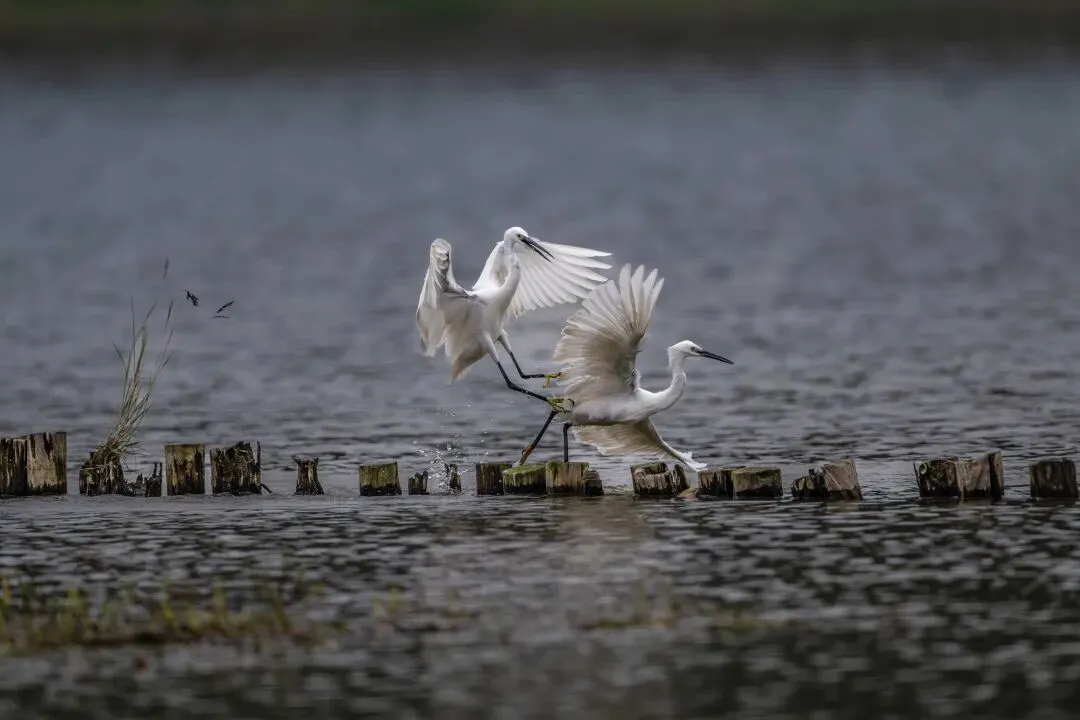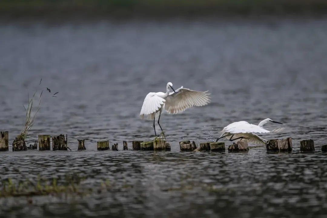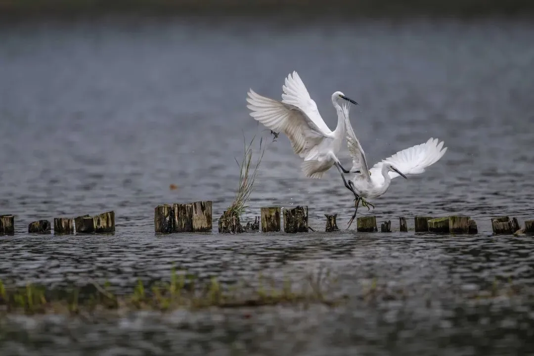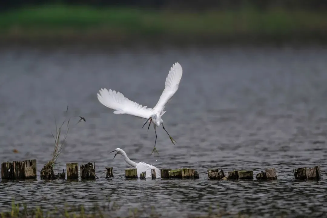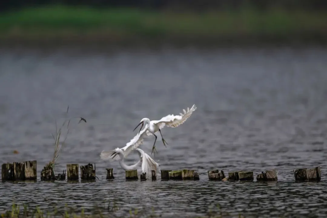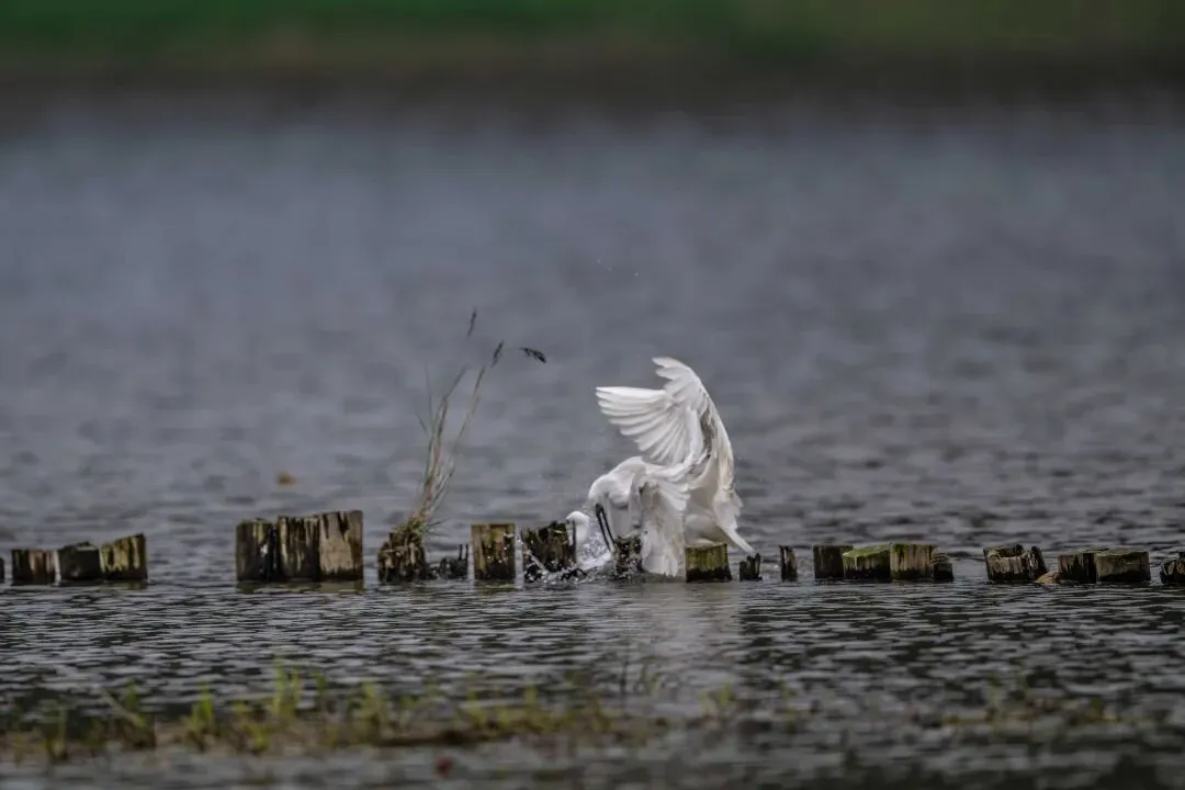 当一缕阳光穿透云层洒向湖面时,树状旁边平静的水面突然泛起涟漪。两只成年白鹭为争夺靠近湖边树状的捕鱼领地,展开了一场惊心动魄的较量。