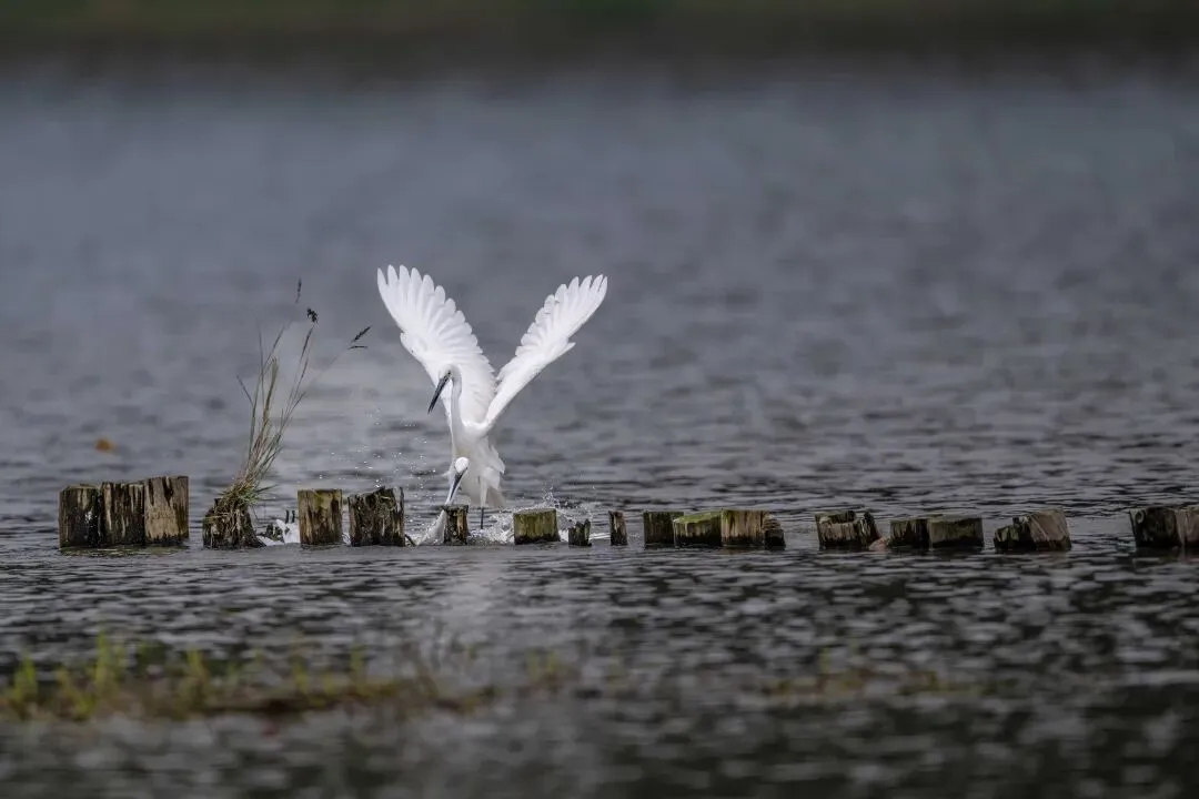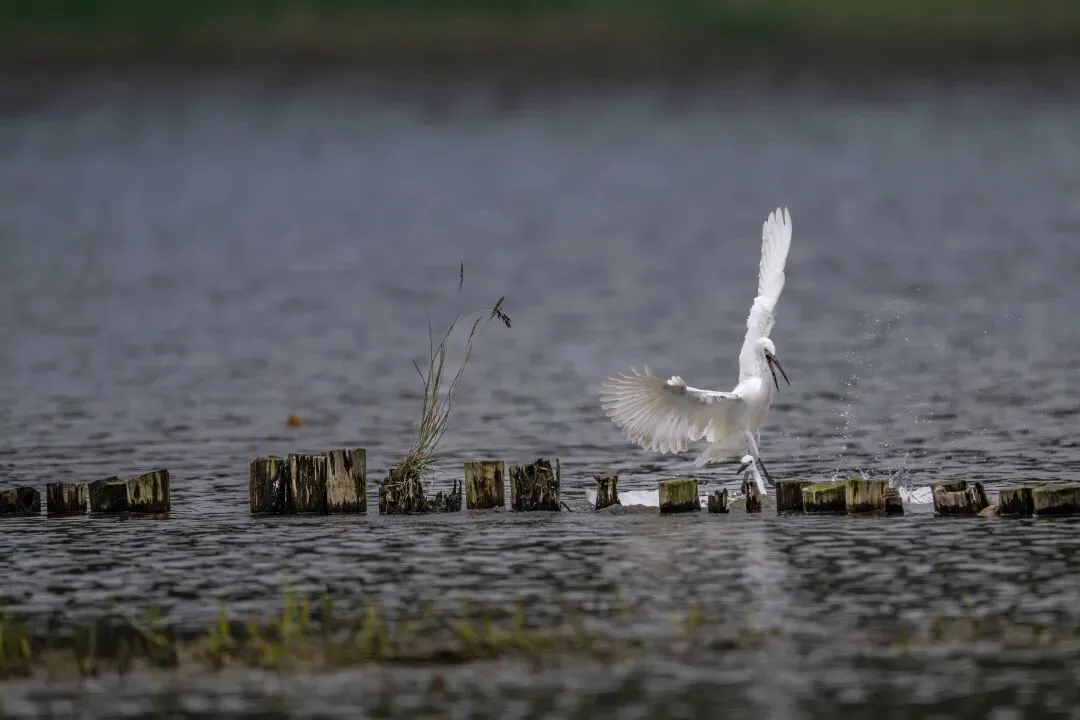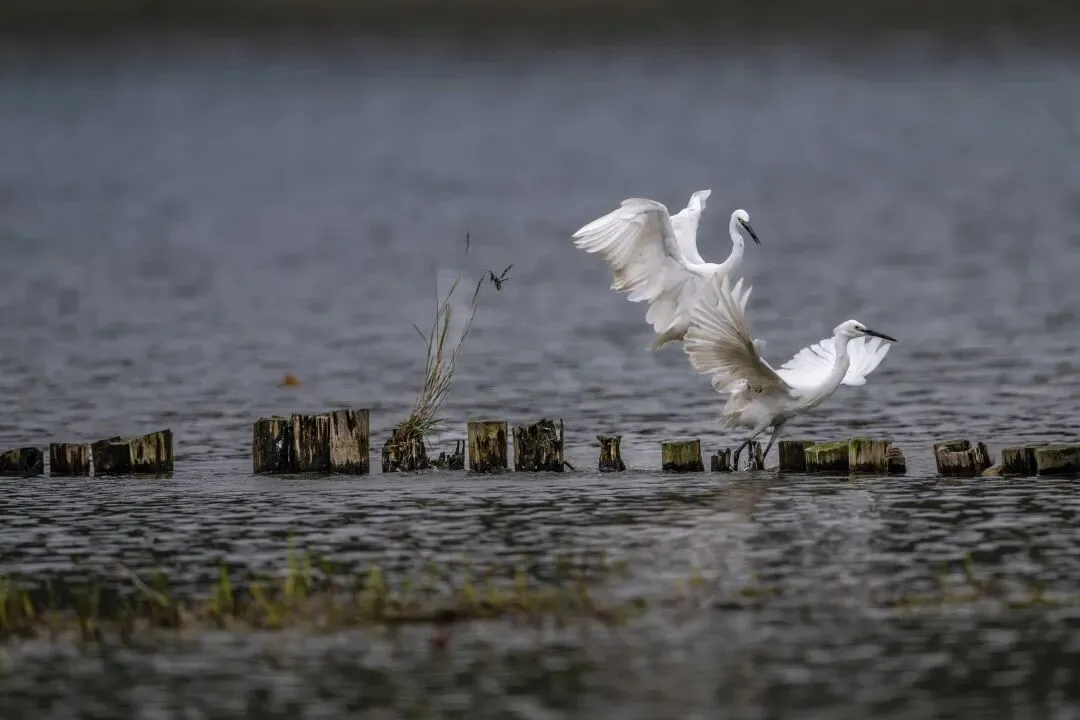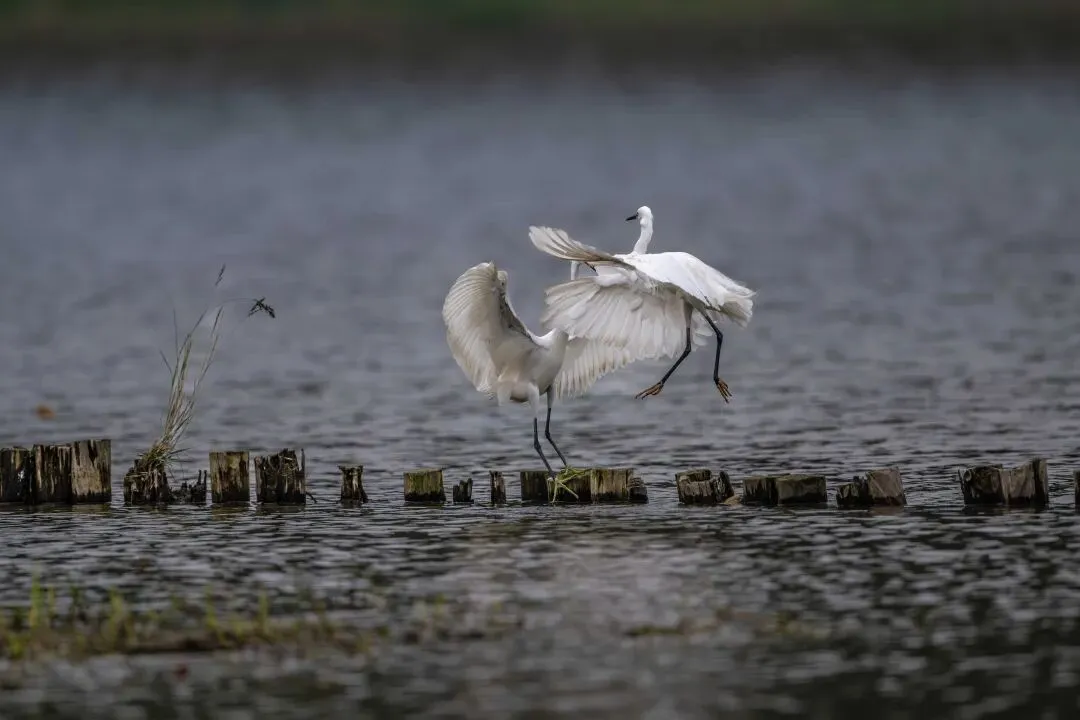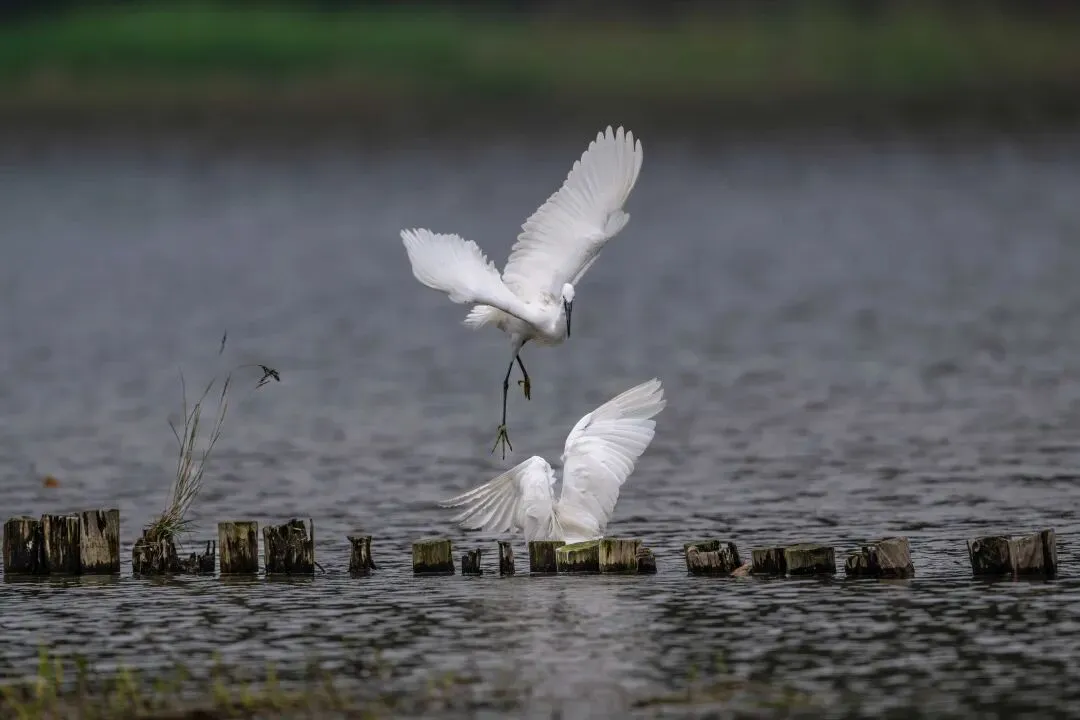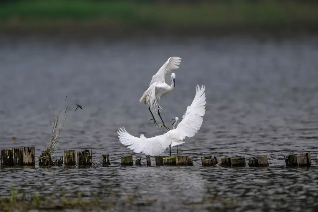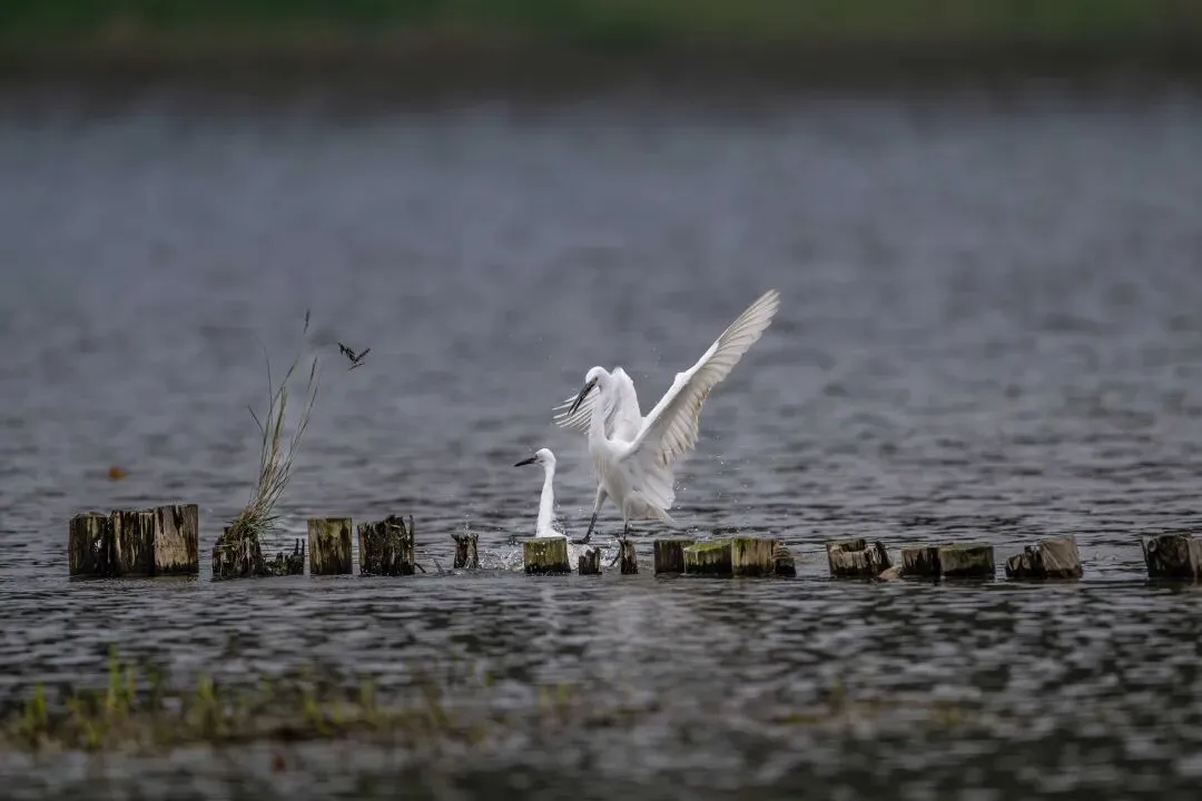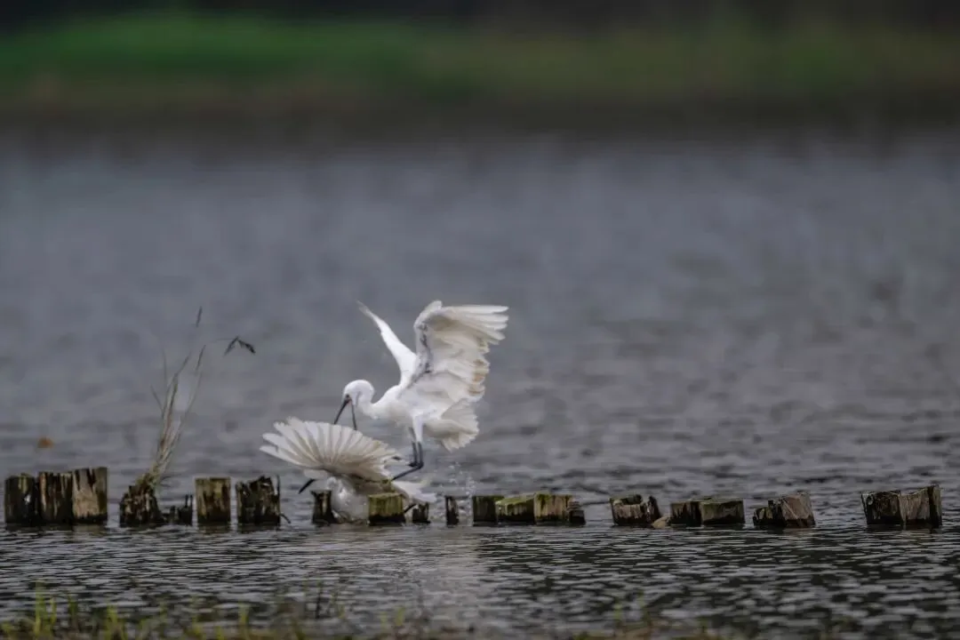 当一缕阳光穿透云层洒向湖面时,树状旁边平静的水面突然泛起涟漪。两只成年白鹭为争夺靠近湖边树状的捕鱼领地,展开了一场惊心动魄的较量。