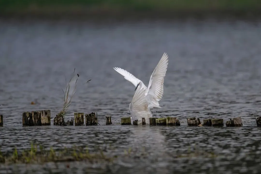 它们时而腾空跃起,双翅展开如白色的风帆;时而低头猛啄,长喙在阳光下闪烁着寒光;时而侧身避让,修长的双腿在水面上灵巧地移动。