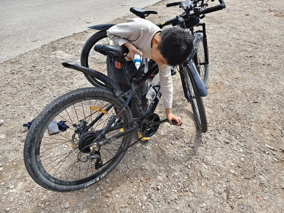 最后一段路,乐爸陪着他骑行,早上八点过就出发,中途只休息了几分钟。