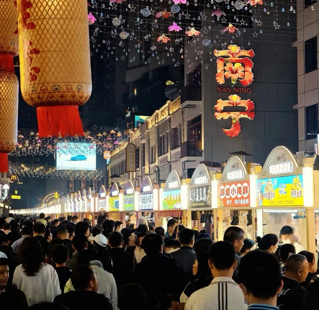 走进三街两巷、中山路、水街连片成型的邕州古城,青砖黛瓦间织入壮锦纹样,老字号食铺飘出熟悉香气。升级后的中山路骑楼风貌修旧如旧,复古窗棂、暖光灯饰、老南宁市井壁画营造出沉浸式消费氛围。热闹背后,文明的细节处处可见:商家门前自觉落实“三包”,游客品尝小吃后将竹签纸巾投入垃圾桶,排队购买老字号美食的长龙井然有序。来自重庆的游客陈女士感叹:“老街改造得很漂亮,更难得的是这么热闹还这么干净,逛着特别舒服。”