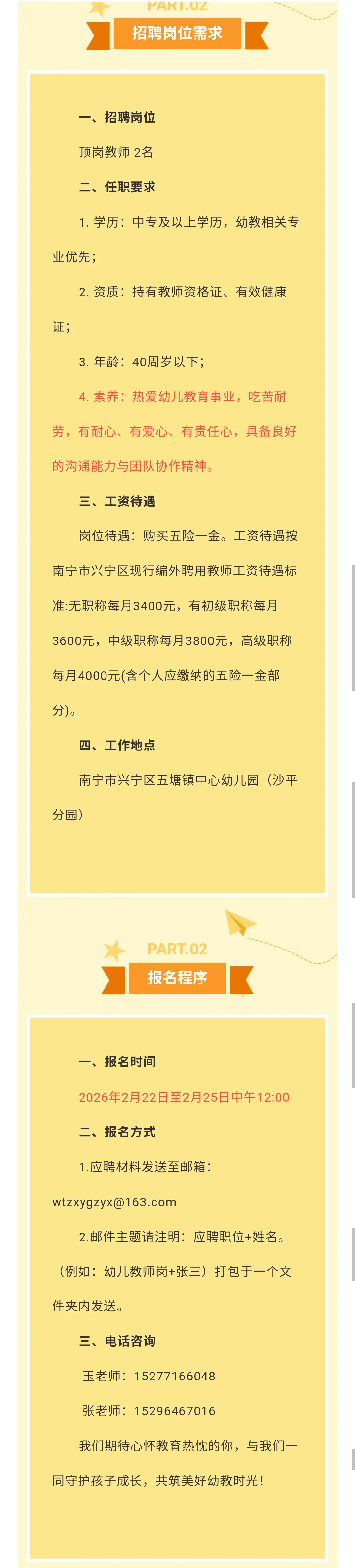 南宁教师招聘:南宁市兴宁区五塘镇中心幼儿园沙平分园招聘