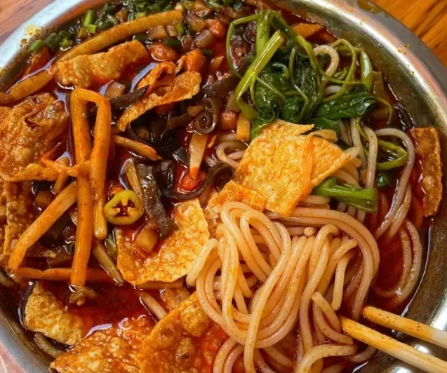 这鸭脚煲讲究得很,鸭脚得先炸,炸出虎皮,再扔进熬了几个小时的螺蛳汤里慢炖。端上来时,红油还在咕嘟,鸭脚吸饱了汤汁,一抿就脱骨。皮是酥的,肉是烂的,辣味顺着喉咙往下钻,一边擦汗一边还得往嘴里塞,汤一喝,人就醒了。