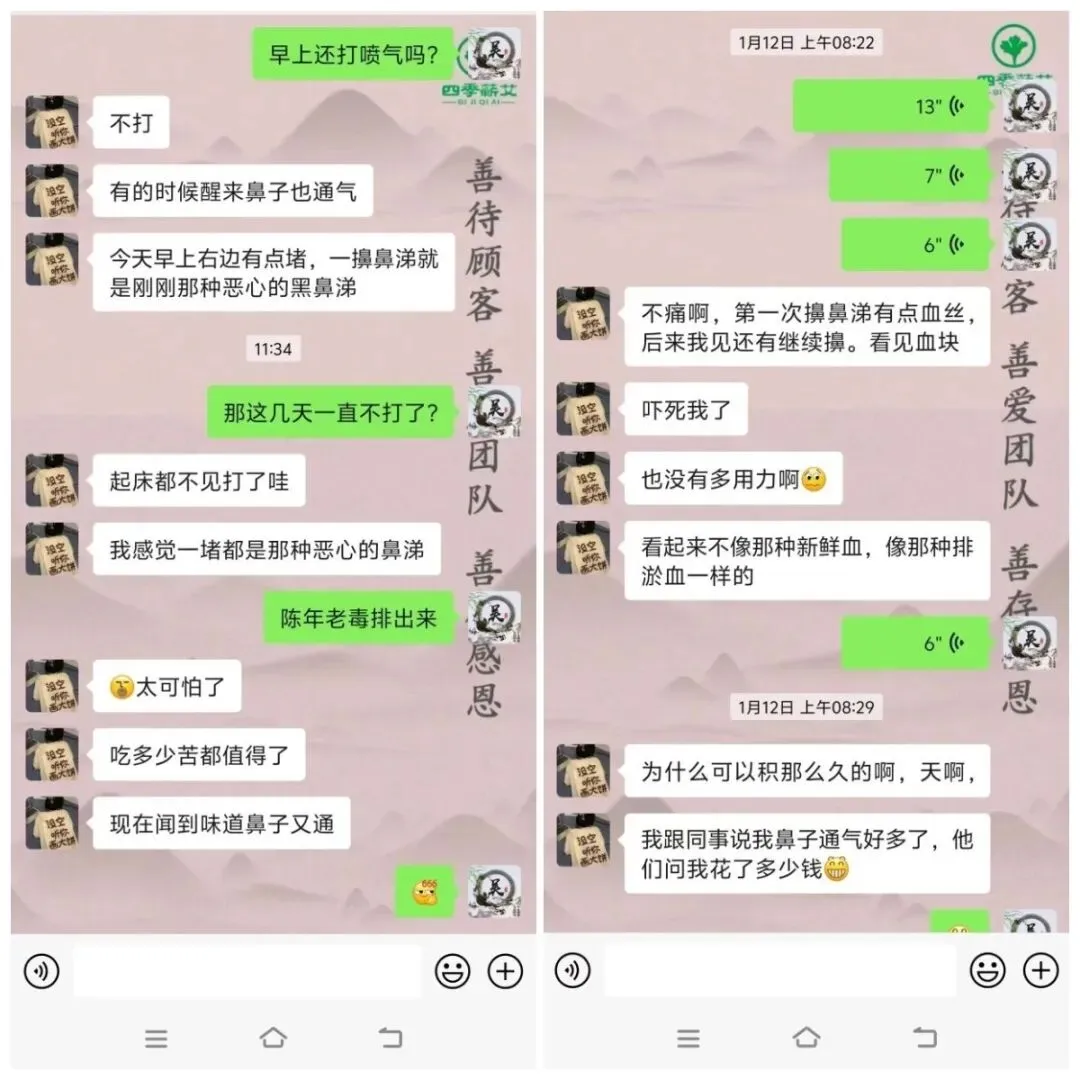 在调理过程中,薛女士经历了一些排病反应。她的后背长出了疹子,咳嗽并排出痰液持续了一个星期。此外,鼻涕中还带有血丝,质地黏稠,且咳嗽时伴有黄痰。这些都是身体在排除病邪的正常反应,说明调理正在发挥作用。