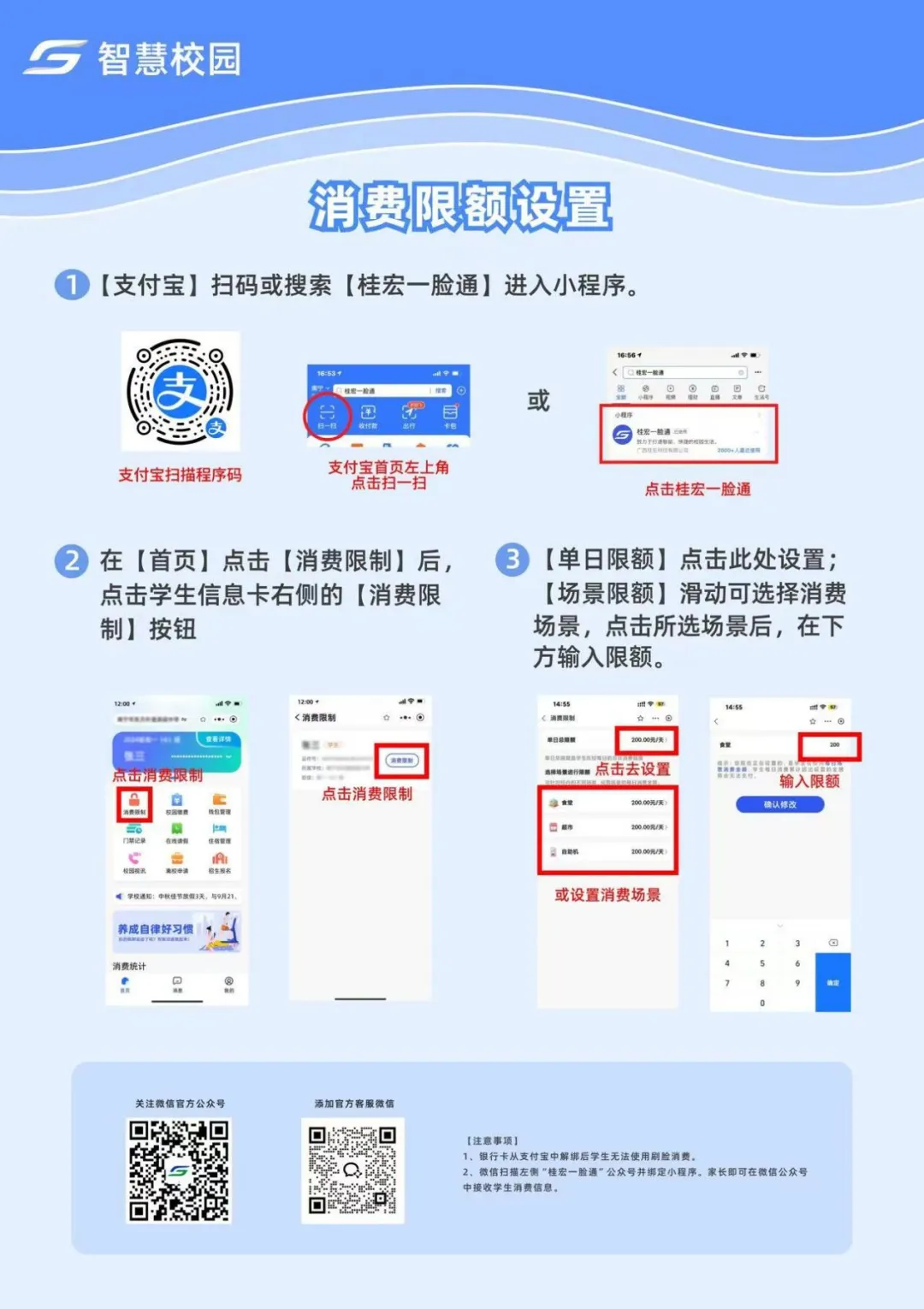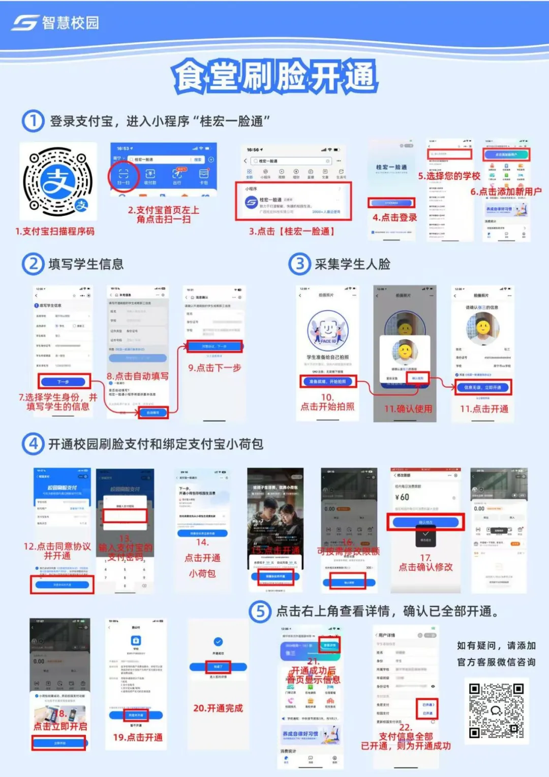 为提升校园生活便利性,我校继续启用面部识别技术系统,用于校园消费及就餐统计。请所有插班生在报到前完成“智慧食堂”签约手续,具体操作流程请参照下方图示,确保到校后能正常使用。