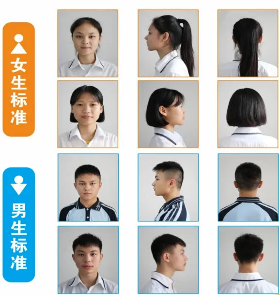 发型要求:前不遮眉、侧不盖耳、后不触领,不染发、不烫发、不留怪发