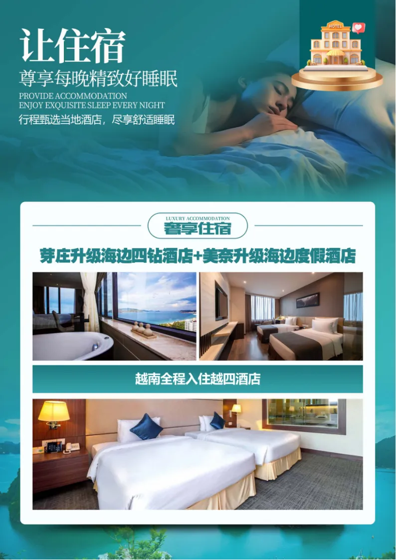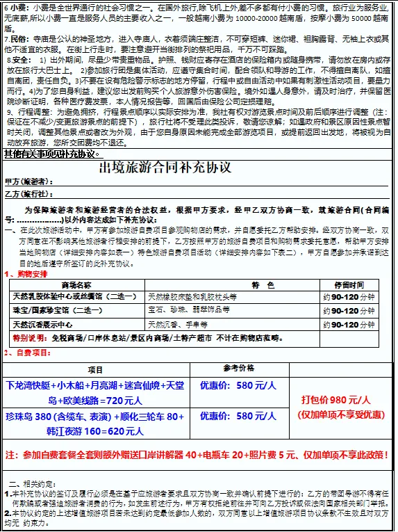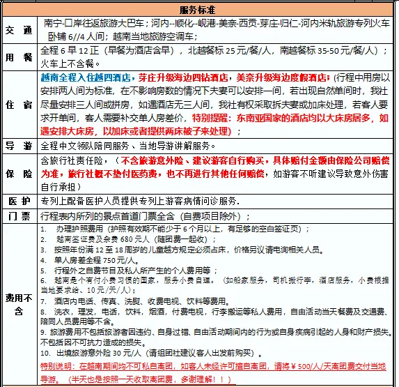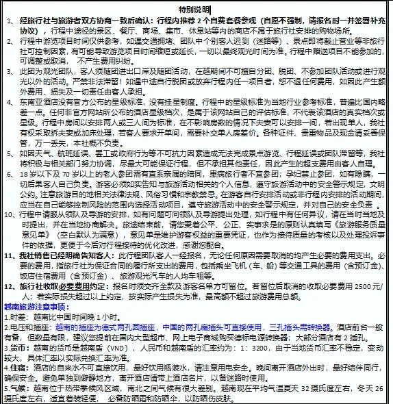3、特别提示:越南行程中所列车程时间,游览时间等以当日实际所用时间为准。具体行程安排游览顺序,旅行社将根据当日地方交通、景区人流 等情况,在不减少景点和游览时间的情况下,旅行社有权调整景点的先后游览顺序与住宿的先后顺序,合理安排行程,敬请理解与配合!