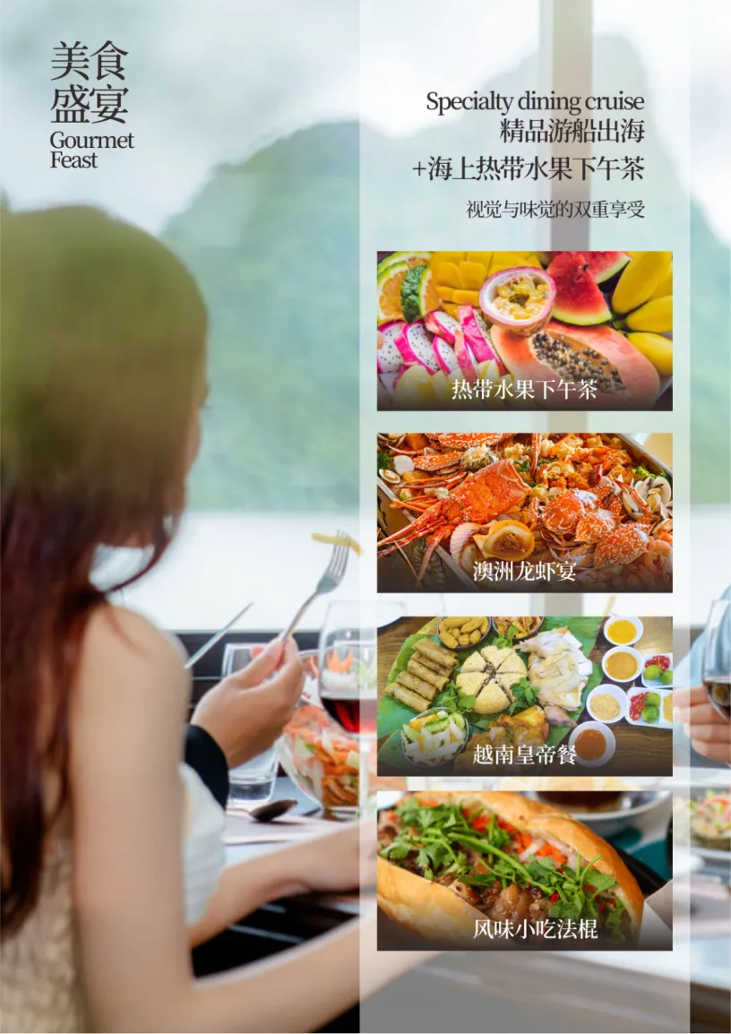 早餐后,乘车前往巡州岛度假区、欣赏海岸风光,后乘越南特色红木游船漫游世界八大自然遗产之一的“海漫游世界八大自然遗产之一的“海上桂林” —下龙湾(游览时间约 4H) (在 1500 多平方公里的海面上、耸立着 3600 多座大小不一、千姿百态的喀斯特地貌的山石、更以其“海美、山幽、洞奇”三绝而享誉天下) ——观狗爬山、香炉山、斗鸡山等数不胜数的风景尽收眼底,再从斗鸡石出发游览下龙湾的精华景点之一【迷宫仙境】。午餐安排于船上进行用餐,下龙湾亦有小渔船如影相随,把酒临风,去国怀乡之忧荡然无存,在天海一色中的游船上大快朵颐的美妙感觉在您的全身悄悄蔓延。船上独家安排特色热带水果下午茶,随后坐船返回码头下船,告别上帝赐于越南最好的礼物---下龙湾。