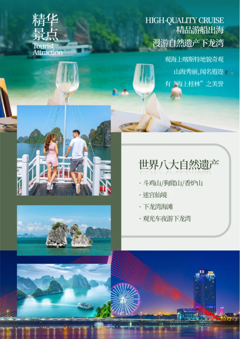 游:七彩贝丘湾/海上红树林/竹山古街/口岸/下龙/精品游船出海/迷宫仙境/下龙湾海滩/河内/欧洲小镇/巴亭广场/胡志明陵/主席府/军事博物馆/还剑湖/三十六条古街/河内大教堂/网红火车街/观光车夜游下龙/升龙湾/鸿基沙滩/十里画廊/象鼻山/狮子岛/玉石沙滩……