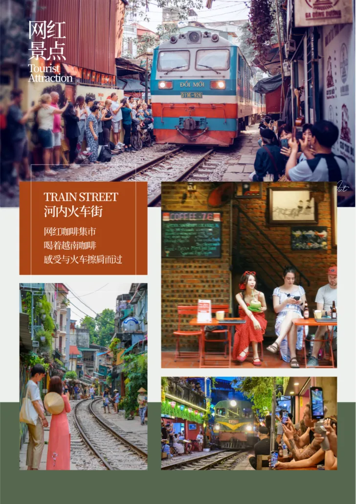 【河内火车街】来河内,必打卡火车街呀!原名泰米街,位于老城区友谊宫西侧,建于1902年法国殖民时期。街道宽约4米,铁轨贯穿其中,两侧是老旧居民楼和咖啡馆、小吃店等。火车每日多次穿行,游客可坐在咖啡馆内,近距离感受火车从身边驶过的独特体验,是河内独特的城市景观。。温馨提示:此为赠送项目,如遇交通管制无法进入游览,不退费用。
