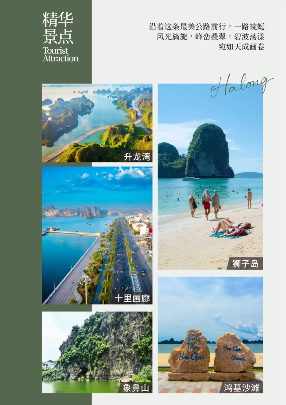 乘车前往越南版【十里画廊】,从下龙沿海公里直下,这一路风景优美,蓝天白云笼罩下宛若名师的一幅画卷。沿途群峰竞秀,百岩争奇,波光凌凌的海水点缀其间,返朴归真,再现了远古文明之典型。丰富的自然景观,人行其间如在画中。远处望去,则是奇峰异石。在期间穿行,就像走入一副自然的山水画卷。
