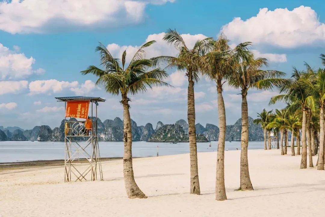 前往【下龙湾海滩】绵延近千米的下龙沙滩,椰树成林,碧浪白沙,海水明澈,碧蓝天空一望无际,与海水相融相接,长长的海滩宛若一条白色绸带蜿蜒在海岸边。沙滩的惬意安然,赤足漫步在海边上能感受到与浪花热情的玩耍邀请。