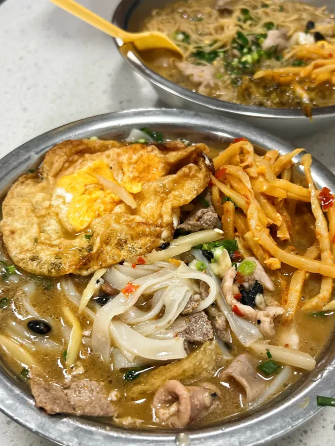 钻进老水街粉店,我对着菜单犯愁。老板娘抹着围裙探头:“头回来?老友猪杂粉加蛋嘛!” 邻桌阿姐把酸笋碟推过来:“酸笋是魂啵!我教你撩(吃)——” 她示范着用筷子卷起浸透汤汁的伊面。结账才八块钱,见我惊呆,老板边舀骨头汤边笑:“在广州要卖二十蚊啦!” 刚出门,卖槐花粉的推车阿婆硬塞我半杯黄皮果酱:“自家熬的,拌粉吃最靓!”
