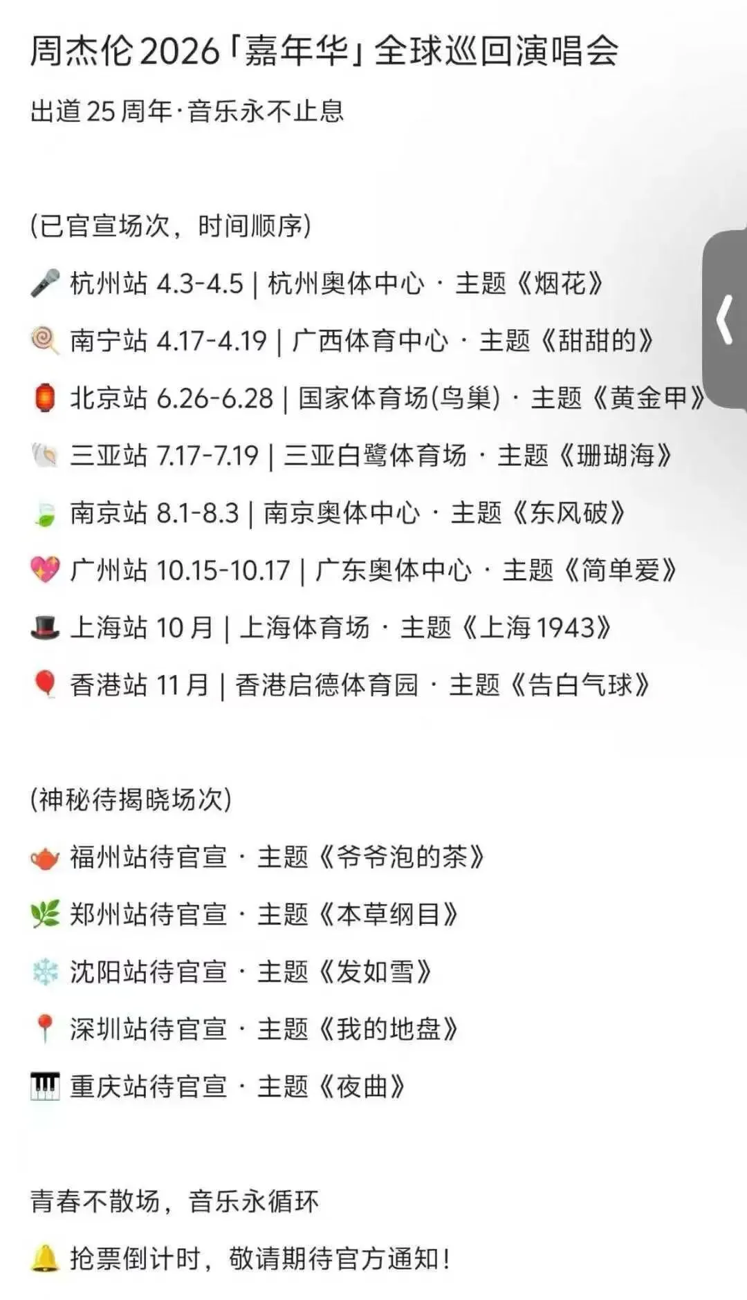 “既呼应南宁‘中国糖都’的甜蜜气质,也承载杰迷对青春最柔软的记忆。”(周杰伦工作室官宣)✨ 出道25周年特别意义:2026年是周杰伦出道25周年!南宁站作为继杭州后的第二站,将首唱2026全新专辑3-4首未公开曲目,南宁杰迷将成为“超前排”聆听者!✨ 周董与南宁的深情羁绊: