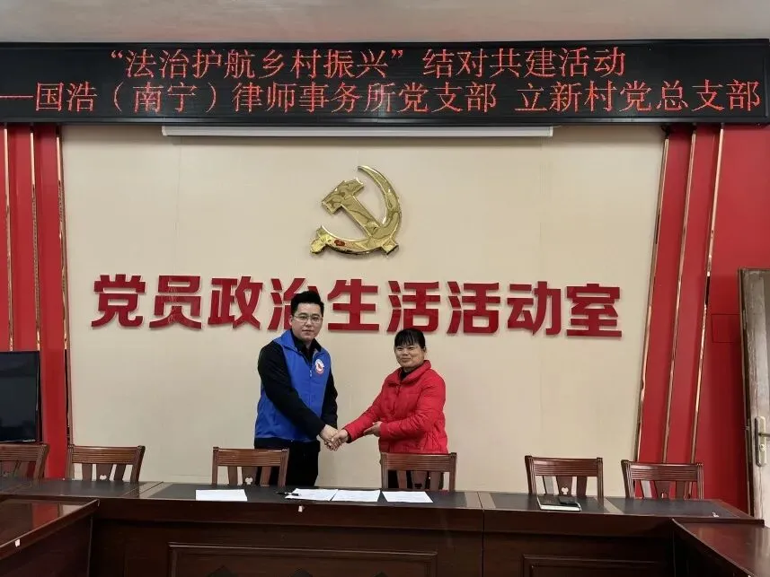 活动当日,国浩南宁公益法律服务团与立新村、龙贵村驻村第一书记及“两委”干部举行座谈交流。会上,双方围绕建立常态化联系机制、持续深化党建和业务融合以及定期开展普法宣传等方面达成广泛共识,并签署了律师事务所党组织与乡村振兴帮扶村党组织结对共建协议。未来,国浩南宁将为两村乡村治理、产业发展等提供专业的法律帮扶。