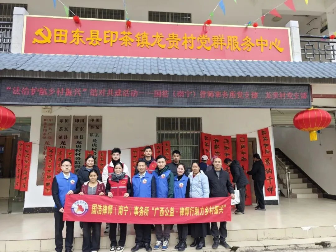 情系乡村,法治惠民。2026年2月10日,为深入贯彻习近平总书记关于加强法治乡村建设的重要指示精神,积极响应自治区司法厅“广西公益·律师行”活动号召,在国浩南宁合伙人朱继斌的带领下,黄华刚、李先明、刘峰、何伟明、易小倩、覃聪、覃肖艳共同组成国浩南宁公益法律服务团,奔赴百色市田东县印茶镇立新村、龙贵村,开展“法治护航乡村振兴,爱心温暖新春佳节”新春下乡慰问暨结对共建活动,将法治温暖与新春祝福送到村民家门口。