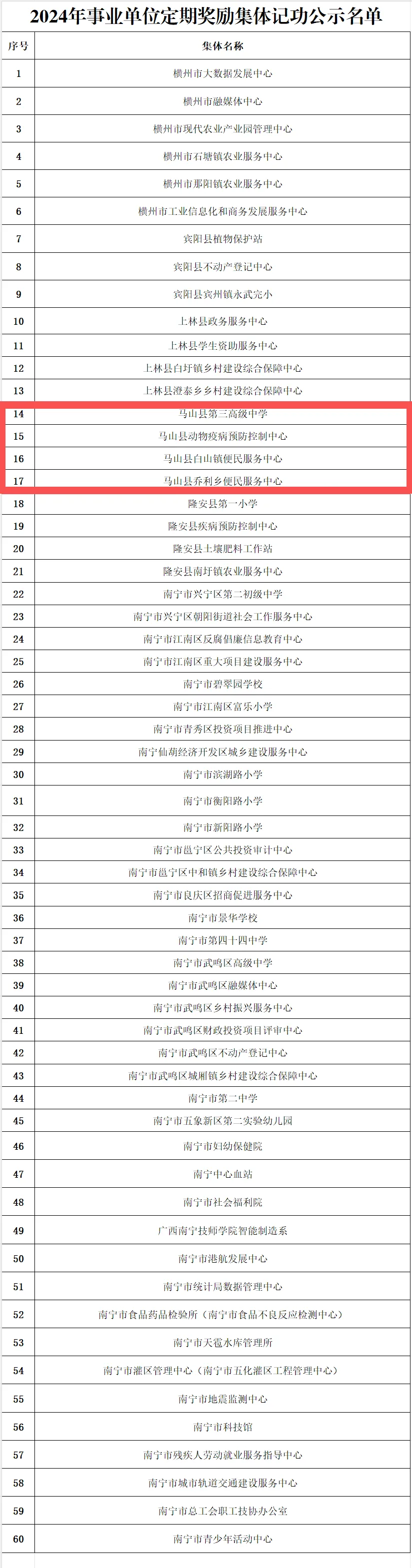 关于2024年度南宁市事业单位定期奖励集体记功名单公示
