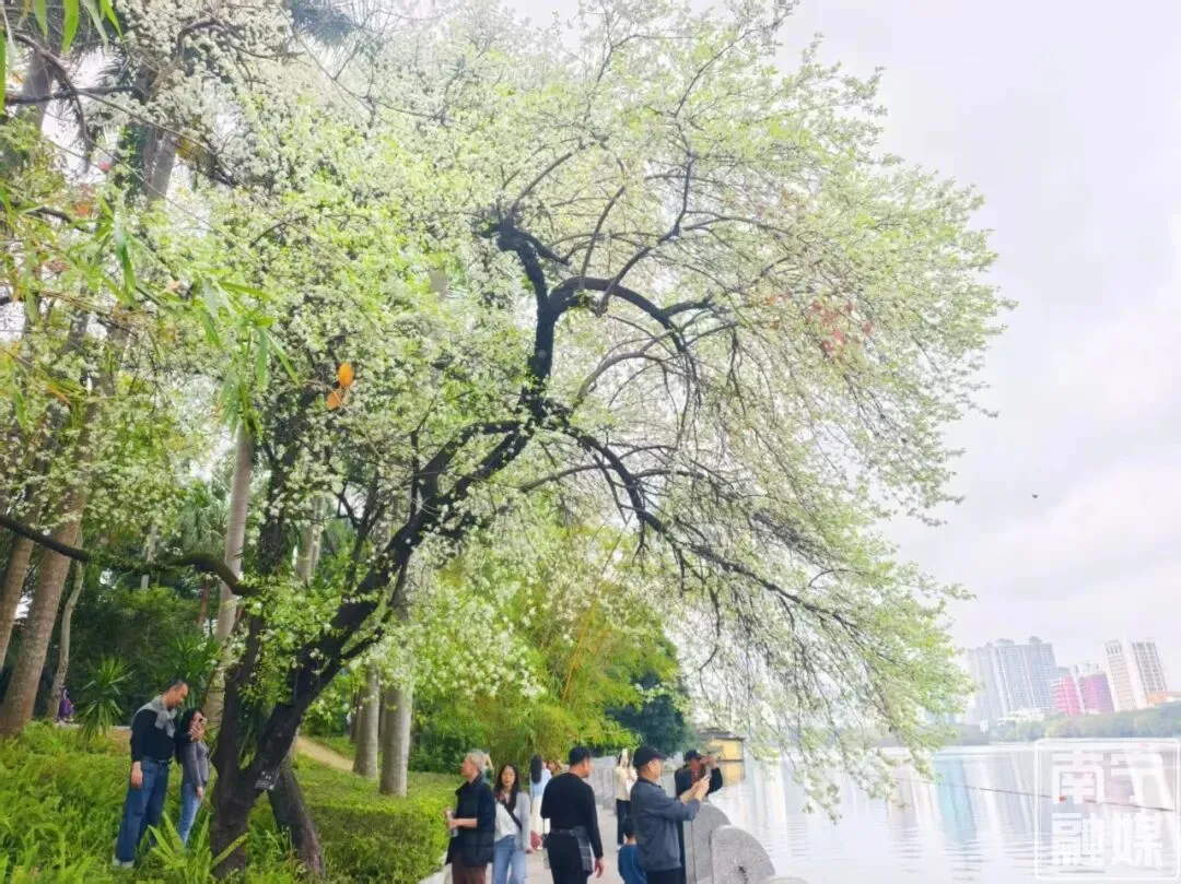 豆梨,梨属落叶乔木,花白色,排列为伞形花序,花后可结出球形梨果,个头不大,直径约1厘米。因其果小如豆,故得名豆梨。豆梨花期较短,约20天,花落结果。近几年来,在公园的细心呵护下,豆梨树花开茂盛,与湖中各式水鸟相映成趣,成为南宁不可多得的一道风景线。