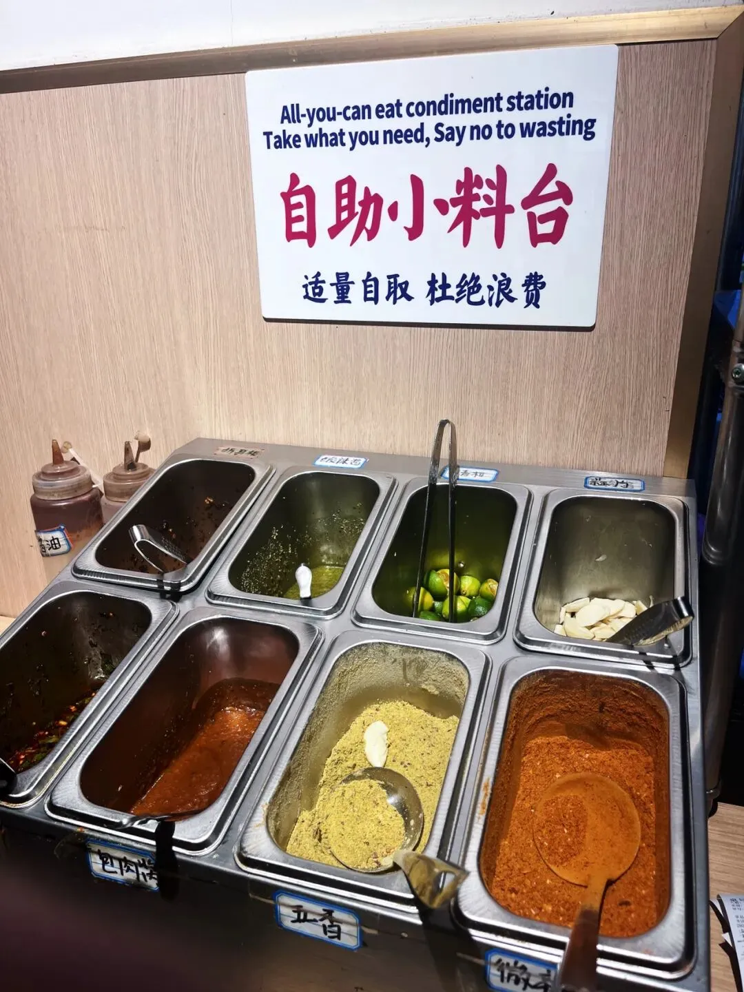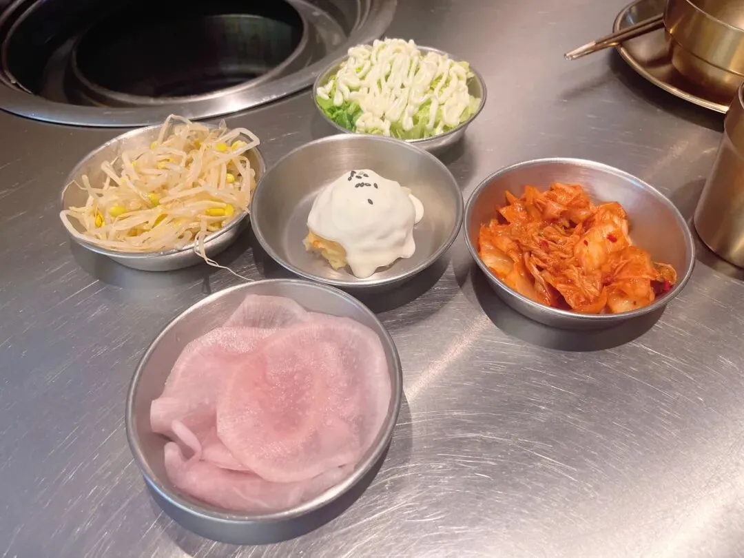 店里小菜、生菜、紫苏叶都是无限续的,调料台干净丰富,连白米饭都可以自助,真的像回家吃饭一样自在。