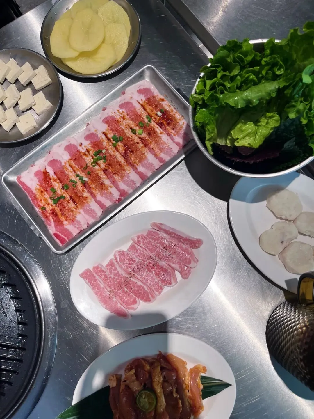 我个人就很喜欢原切肉,简单烤一烤,蘸点干碟,包上生菜或紫苏叶,一口下去,香迷糊了。