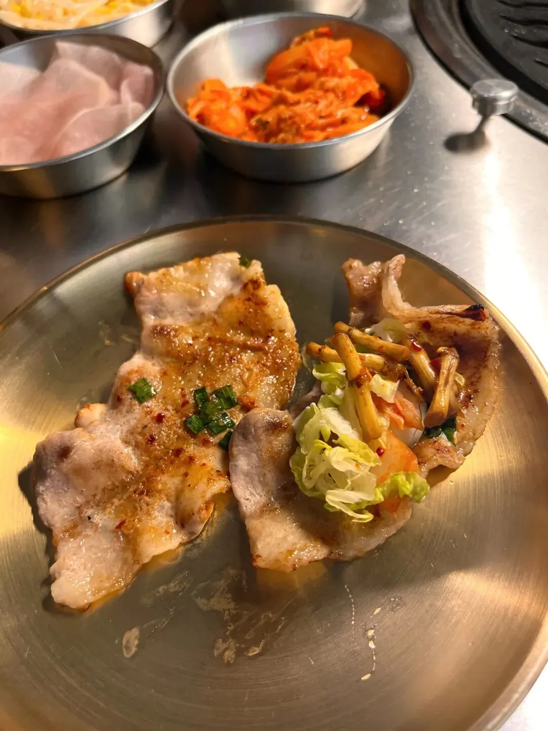 外焦里嫩,肉感爆棚,蘸上辣椒面再夹一片蒜,包进生菜里——食肉星人的终极满足。