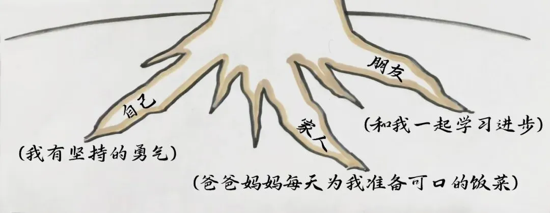 你可以先画几条粗壮的树根,作为大树的根基。在每根树根上写出能支持你达成目标的人和事物。如图: