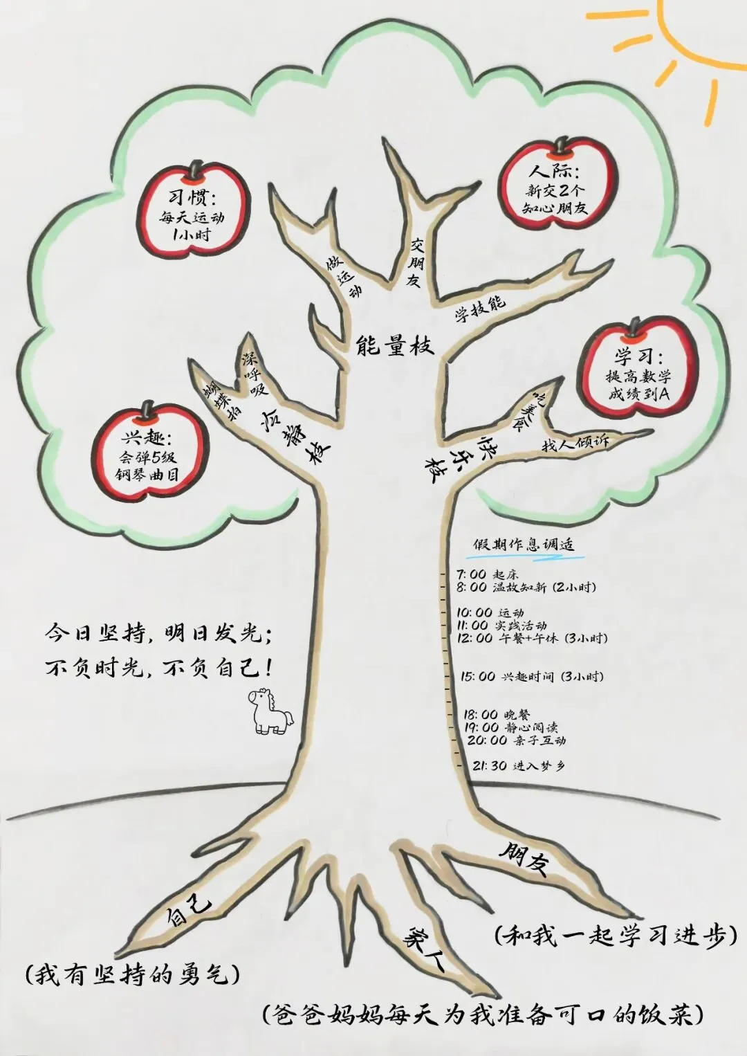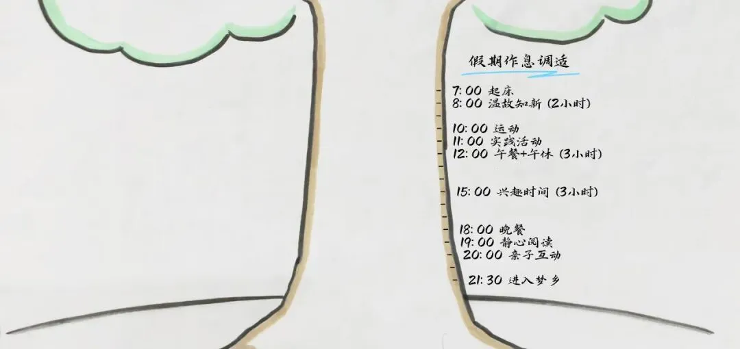 现在画树干,在开学预备周规律作息,劳逸结合,让身体逐渐适应上学节奏。在树干上标注个人作息时间安排: