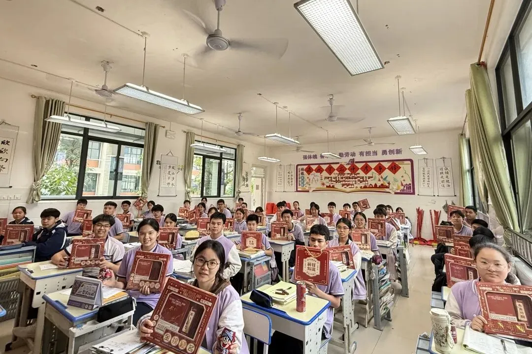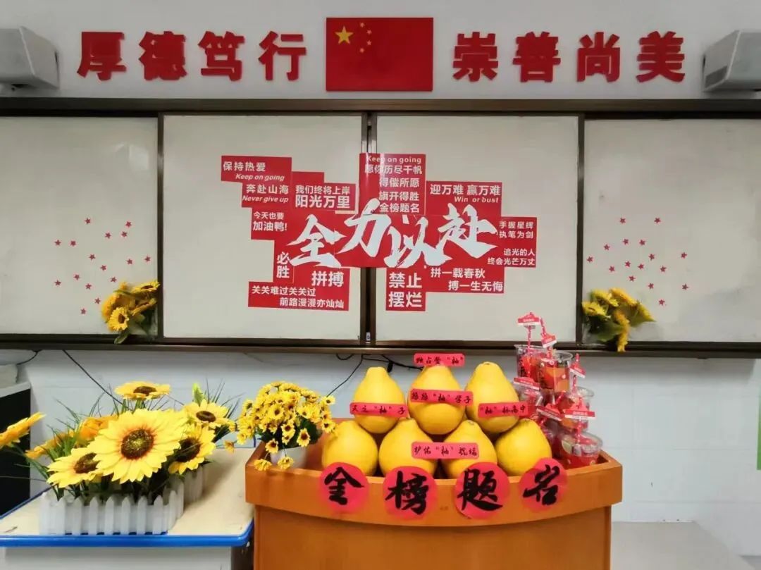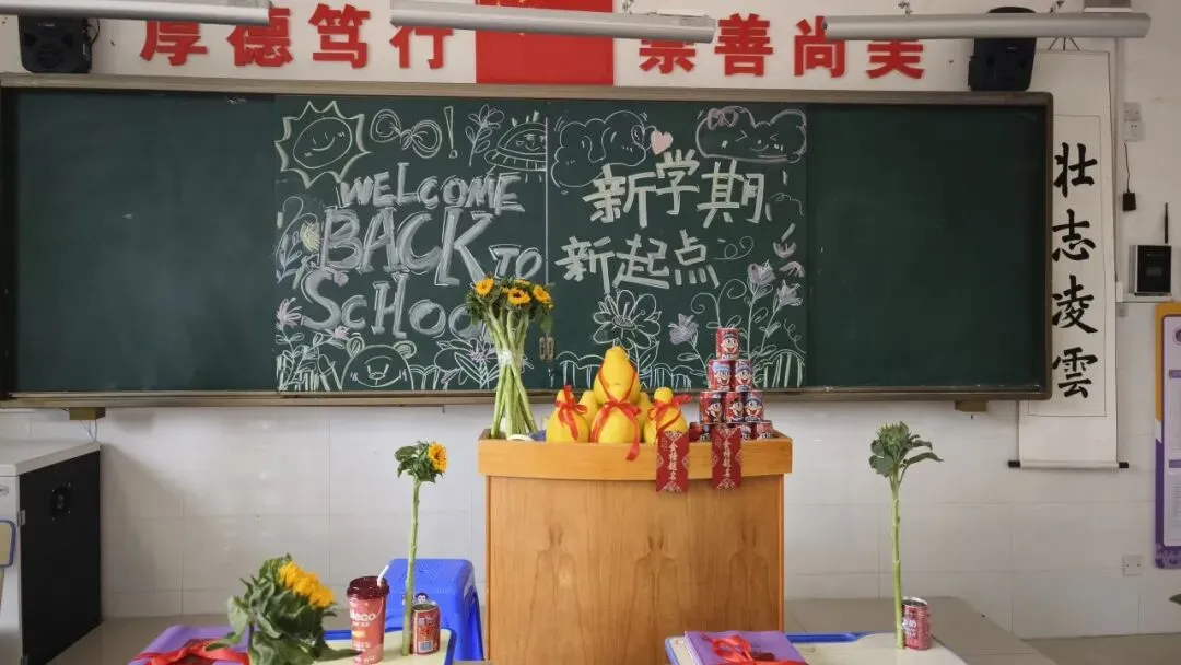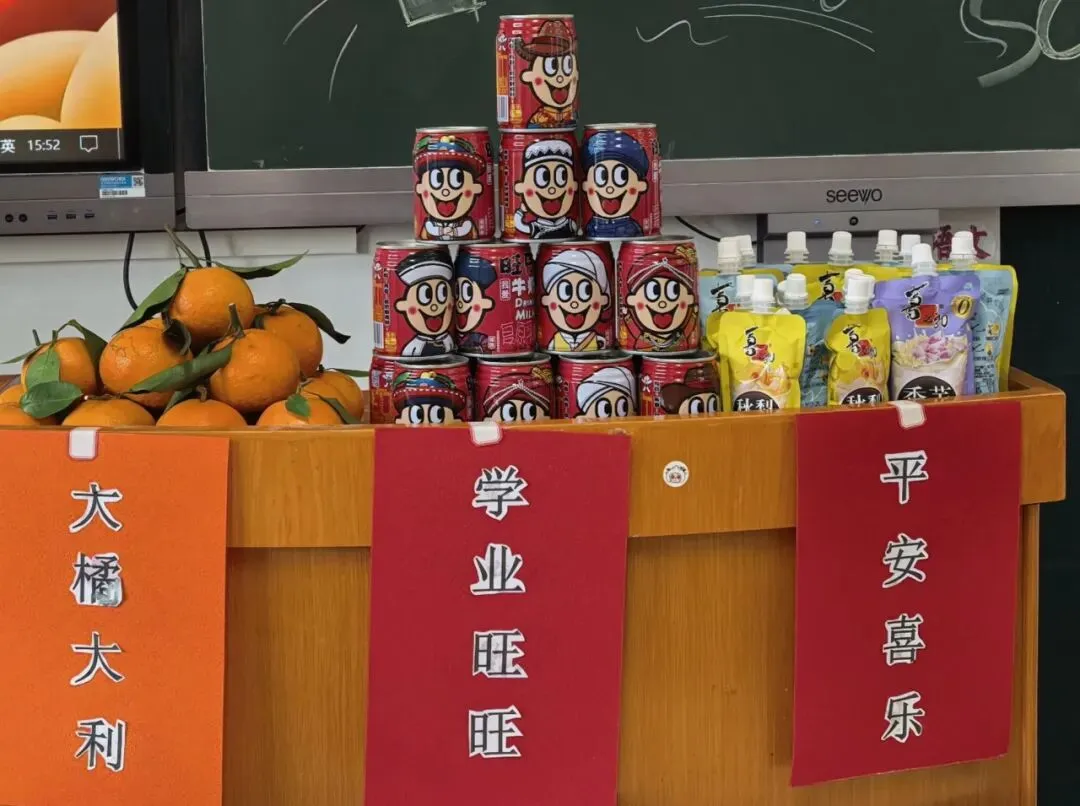 走进教室,黑板上画满了励志板报和可爱的卡通图案,每一张课桌上都整齐摆放着系有红丝带的新课本,旁边还贴心放置了寓意大吉大利的橘子和象征平安喜乐的果冻,更有旺仔牛奶期待着大家新学期“学业旺旺”。