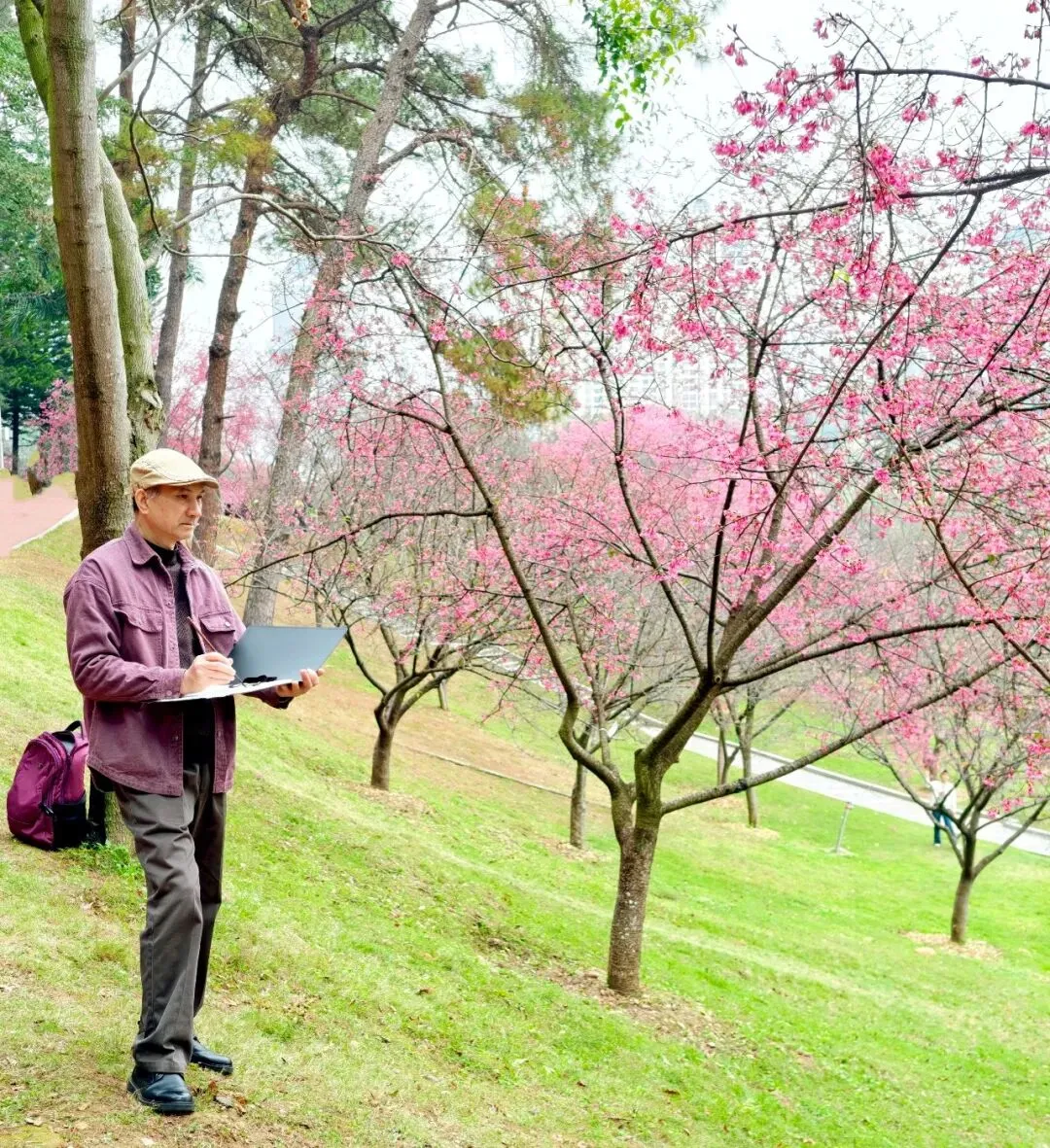 张向明在石门公园画樱花草稿(照片)