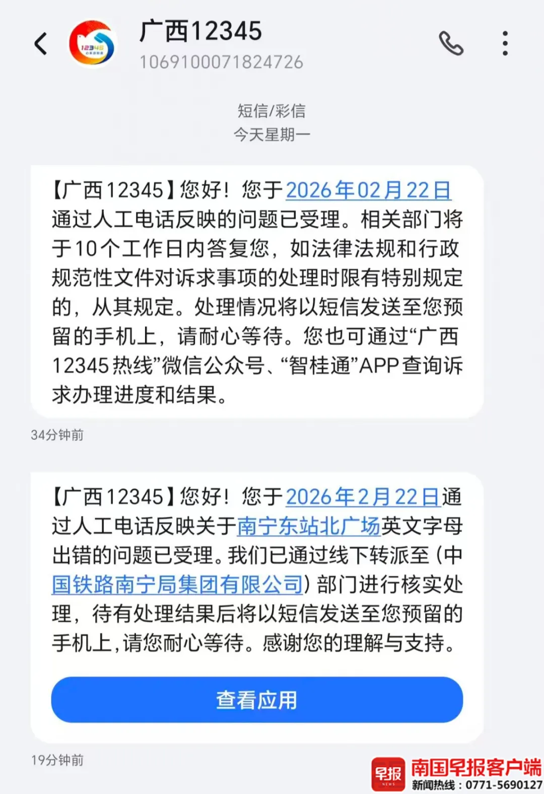 当天下午,南宁轨道智慧生活服务集团有限责任公司相关人员回应称,接到记者反馈后,他们已立即上报,公司高度重视南宁东站枢纽部分指引标识英文字母错误问题,已第一时间安排专人对枢纽全域指引标识开展全面排查。针对排查发现的错误标识,将先用同底色胶布临时遮盖,避免误导市民,同时已将问题正式反馈给原标识制作及施工单位,督促其尽快重新制作并更换。